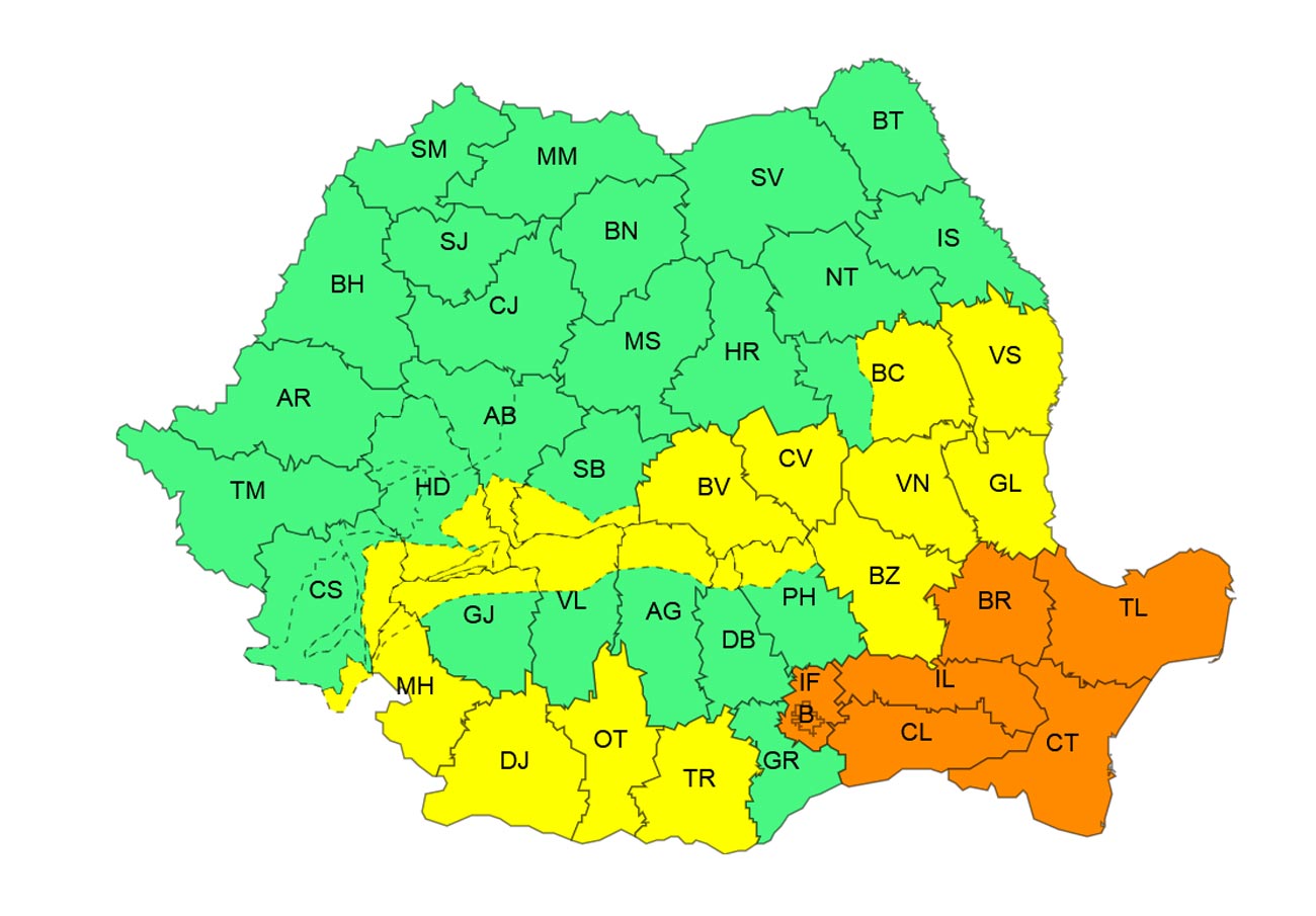 Conform informări recente a Administrației Naționale de Meteorologie (ANM), codul portocaliu ce vizează zona de sud-est se prelungește până la ora 23.00.