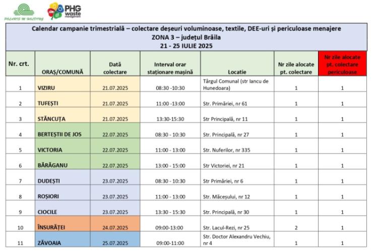 Toate persoanele cu domiciliul în localitățile din Zona 3 din județul Brăila au posibilitatea să se debaraseze, fară costuri suplimentare, de obiectele voluminoase pe care nu le mai folosesc, care le ocupă spațiul din gospodărie, prin predarea acestora la punctul fix de colectare, stabilit de comun acord cu primăriile comunelor. În punctul fix de colectare, în perioada 21 – 25 iulie, în ziua de colectare stabilită pentru fiecare comună, conform graficului atașat, va staționa o mașină cu însemnele campaniei, unde se vor prelua deșeurile voluminoase, textile în intervalul orar stabilit pentru fiecare comună.