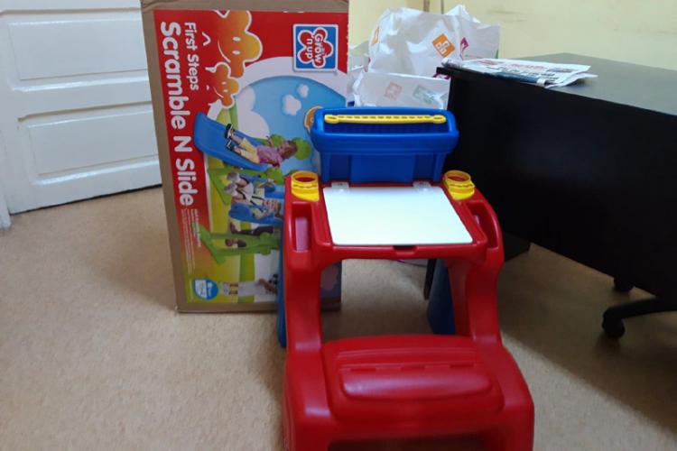 • o doamnă care a dorit să-şi păstreze anonimatul ne-a adus, vineri, o cutie uriaşă în care se află un ansamblu format dintr-un tobogan şi un leagăn din plastic • cu siguranţă, micii pacienţi de la Pediatrie vor fi foarte încântaţi de această mega-jucărie • tot vineri, o altă mămică ne-a mai adus o măsuţă de lucru, mai multe jucării, dar şi 50 lei