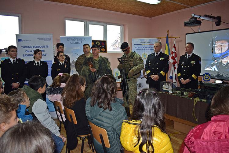 • comandor Marcel Neculae, comandantul Flotilei Fluviale, și locțiitorul Flotei, comandorul Nicu Chirea, au promovat profesia militară în comuna natală • cei doi ofițeri au ilustrat, prin propriul exemplu, faptul că performanțele au avut la bază visul de a îmbrăca uniforma liceului militar • militarii Flotilei Fluviale au prezentat machete de nave de luptă, instrumente de navigație și echipamente ale pușcașilor marini