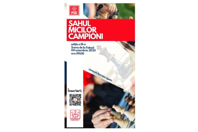 • potrivit unui comunicat de presă emis de organizația județeană a PSD Brăila, competiția ”Șahul Micilor Campioni” ajunsă la ediția a III-a, va avea loc în acest an pe 4 octombrie, la scena de la Faleza Dunării • evenimentul organizat de Tineretul Social Democrat și PSD Brăila se adresează copiilor și tinerilor cu vârsta între 6 și 14 ani • TSD Brăila a anunțat că vor exista și premii, iar cei interesați se pot înscrie online sau la sediul Partidului Social Democrat