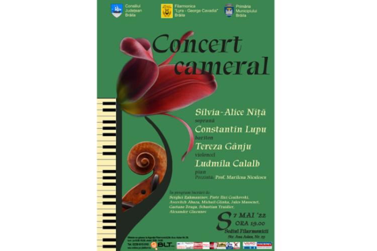 Consiliul Județean Brăila, Primăria Municipiului și Filarmonica „Lyra-George Cavadia” Brăila îi invită pe brăileni la un Concert cameral de excepție oferit de talentații muzicieni – cunoscuți deja publicului autohton – soprana Silvia-Alice Niță, baritonul Constantin Lupu, violoncelista Tereja Gânju și pianista Ludmila Calalb. Potrivit organizatorilor, repertoriul abordat de cei patru muzicieni a garantat succesul apariției lor anterioare și cu siguranță ne va captiva și de data aceasta.