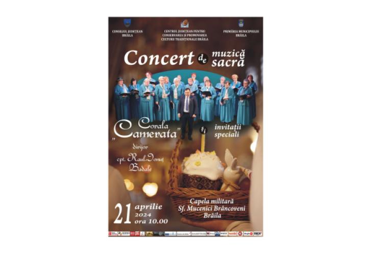 Corala Feminină „Camerata” a Centrului Județean pentru Conservarea și Promovarea Culturii Tradiționale Brăila (Centrul de Creație), în colaborare cu Consiliul Județean și Primăria Municipiului Brăila va susține duminică, 21 aprilie, începând cu ora 10.00, un Concert de muzică sacră, sub bagheta dirijorală a cpt. Raul Ionuț Badale. La evenimentul care va avea loc la Capela Militară „Sfinții Mucenici Brâncoveni”, din cartierul Viziru, vor particpa, de asemenea, invitați speciali ai Coralei „Camerata” și ai parohiei brăilene.
