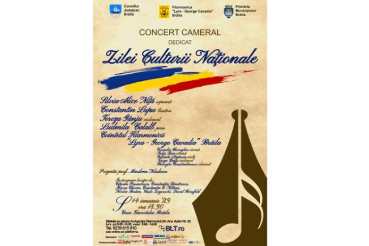 „Ziua Culturii Naționale reprezintă un moment de redescoperire a valorilor, a identității și amprentei românești, de reconectare cu muzica și cultura națională, filon al ființei și suflului nostru. Filarmonica „Lyra – George Cavadia” Brăila, susținută de Consiliul Județean și Primăria Municipiului Brăila marchează această incursiune către universul valoric al națiunii noastre printr-un Concert Cameral în care invitați cunoscuți și îndrăgiți de dumneavoastră vă vor transmite prin graiul muzicii simțirile din spatele repertoriului valoros abordat”, precizează, într-un comunicat, prof. Alexandra Gurgu, secretarul muzical al Filarmonicii „Lyra – George Cavadia” Brăila.