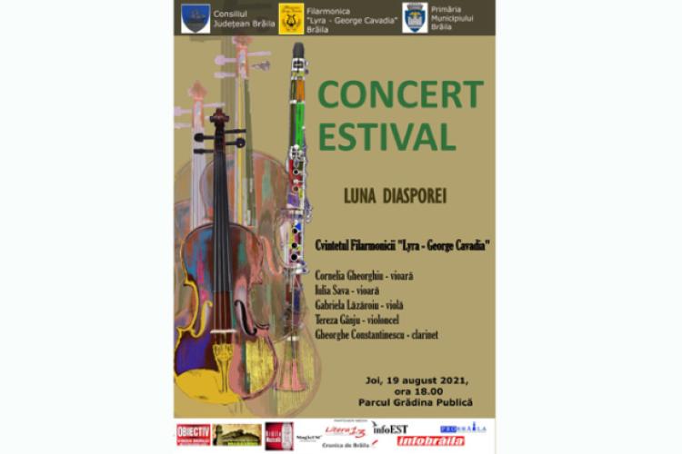 Joi, 19 august, de la ora 18.00, are loc în Grădina Publică din Brăila un nou concert estival marca Filarmonica „Lyra – George Cavadia”, intitulat „Luna Diasporei”. Vor evolua artiștii instrumentiști ai Cvintetului Filarmonicii „Lyra – George Cavadia” Brăila, binecunoscuți publicului iubitor de muzică cultă din orașul nostru: Cornelia Gheorghiu – vioară I, Iulia Sava – vioară II, Gabriela Lăzăroiu – violă, Tereza Gânju – violoncel și Gheorghe Constantinescu – clarinet.