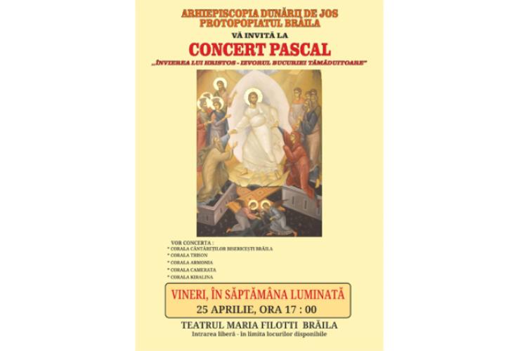 Protopopiatul Brăila și Arhiepiscopia Dunării de Jos îi invită pe brăileni la tradiționalul Concert Pascal din Săptămâna Luminată, care va avea loc în ziua de vineri, 25 aprilie, (sărbătoarea Izvorului Tămăduirii), de la ora 17:00, la Teatrul „Maria Filotti”. Intrarea la mult-așteptatul Concert Pascal este liberă, în limita locurilor disponibile.