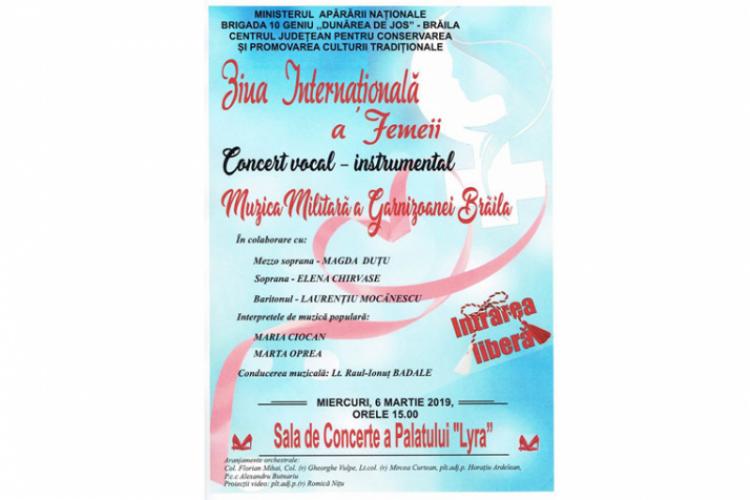 Sala de concerte a Palatului LYRA găzduieşte astăzi, 6 martie, un concert vocal-instrumental susţinut de Muzica Militară a Garnizoanei Brăila, dedicat Zilei Internaţionale a Femeii. Evenimentul este organizat de Ministerul Apărării Naţionale Brigada 10 Geniu “Dunărea de Jos-Brăila şi Centrul Judeţean pentru Conservarea şi Promovarea Culturii Tradiţionale în colaborare cu mezzo soprana Magda Duţu, soprana Elena Chirvase şi baritonul Laurenţiu Mocănescu. Pe scena Palatului LYRA vor cânta şi interpretele de muzică populară Maria Ciocan şi Marta Oprea, iar conducerea muzicală va fi realizată de lt. Raul Ionuţ Balade.