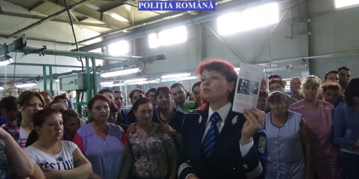 Vizita poliţiştilor de la compartimentul Analiza şi Prevenirea Criminalităţii la o fabrică de încălţăminte, situată în judeţul Brăila, a oferit angajatelor posibilitatea de a afla că violenţa, sub toate formele de manifestare, afectează dreptul la viaţă, integritate fizică şi psihică. Lovirea şi celelalte fapte agresive manifestate în familie, pe stradă sau la locul de muncă, influenţează negativ dezvoltarea familiei, precum şi randamentul la serviciu. "Angajatele fabricii au discutat cu poliţiştii despre urmările pe care un mediu familial violent le are asupra copiilor, despre modul în care aceştia din urmă, ajunşi adulţi, vor înţelege că trebuie să se poarte cu părinţii sau cu propriii copii. Li s-a explicat cum violenţa determină violenţă asupra celui care o exercită, cum agresivitatea se întoarce asupra agresorului, cum tolerând traiul într-un mediu violent, dezvoltarea personală şi a relaţiilor sociale sunt grav afectate", a precizat agent şef adj. Camelia Bucur din cadrul Inspectoratului de Poliţie Judeţean Brăila.