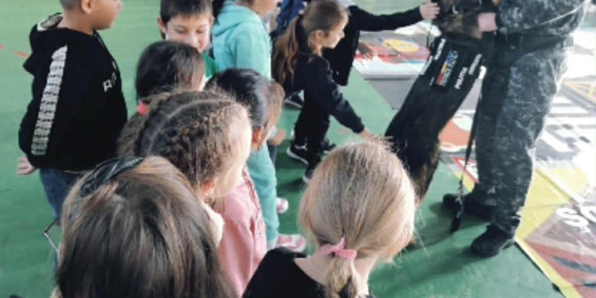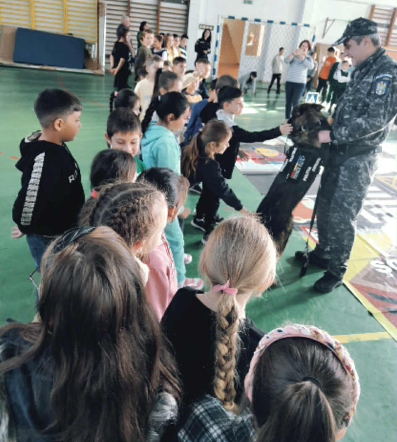 • elevii au primit sfaturi de la polițiști pentru prevenirea violenței în școli și a comportamentelor de tip bullying și cyberbullying • s-a discutat și despre siguranța acasă, la școală și pe stradă • câinele polițist Myke i-a atras pe copii