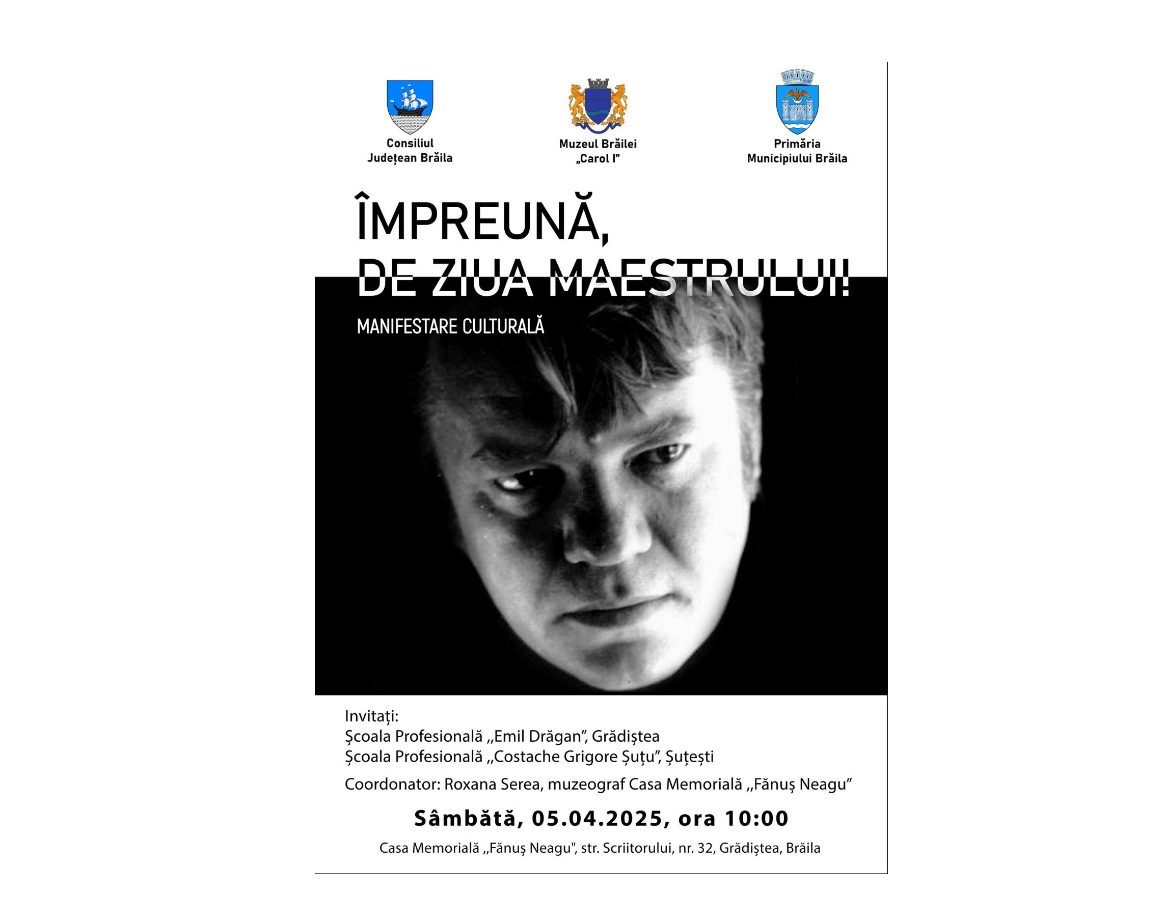 Astfel, Muzeul Brăilei „Carol I” - Casa Memorială „Fănuș Neagu” organizează sâmbătă, 5 aprilie, de la ora 10:00, evenimentul cultural „Împreună, de ziua maestrului”. Invitați sunt elevii Școlii Profesionale „Emil Drăgan”, din localitatea Grădiștea, și elevii Școlii Profesionale „Costache Grigore Șuțu”, din localitatea Suțești. Coordonator al manifestării: Roxana Serea, muzeograf la Casa Memorială „Fănuș Neagu” (Strada Scriitorului nr. 32, comuna Grădiștea) - locul de desfășurare al evenimentului cultural.