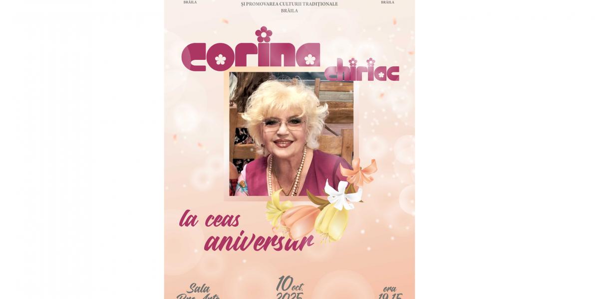 Astfel, Consiliul Județean Brăila și Centrul Județean pentru Conservarea și Promovarea Culturii Tradiționale, cu sprijinul Primăriei Municipiului Brăila, organizează vineri, 10 octombrie, începând cu ora 19:15, Conferința „Corina Chiriac, la ceas aniversar”, cu participarea artistei care a scris istorie în muzica ușoară românească, cu proiecte expoziționale, autoare de cărți și lucrări de specialitate. Evenimentul se va desfășura în Sala ProaArte a Centrului Judeţean pentru Conservarea şi Promovarea Culturii Tradiţionale, din Piața Traian nr. 2 și va fi transmis, live, pe pagina de Facebook: Centrul.de.Creatie.Braila.