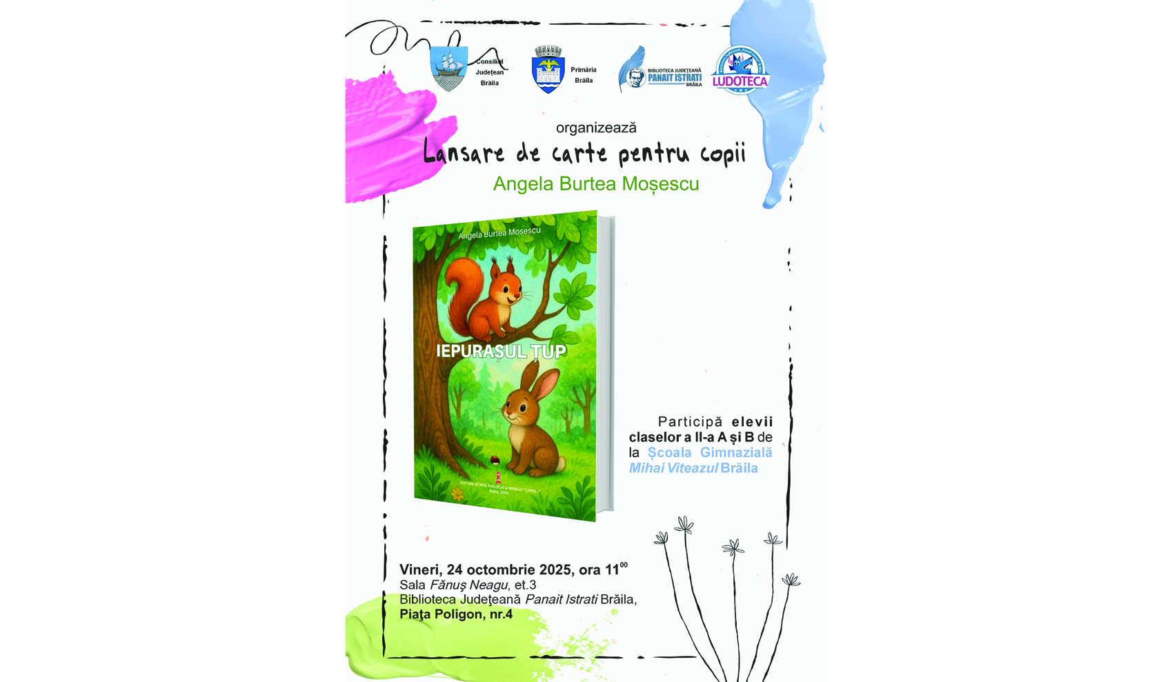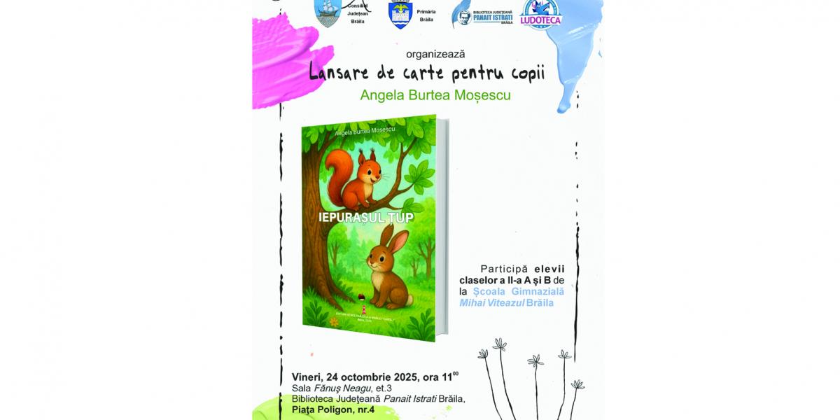 Biblioteca Județeană „Panait Istrati” Brăila îi invită pe brăileani la lansarea celei mai recente cărți semnate de autoarea și cadrul didactic Angela Burtea Moșescu - „Iepurașul Țup”. Evenimentul va avea loc vineri, 24 octombrie, de la ora 11:00, în Sala „Fănuș Neagu” a bibliotecii publice, situată în Piața Poligon nr. 4, din municipiul Brăila.