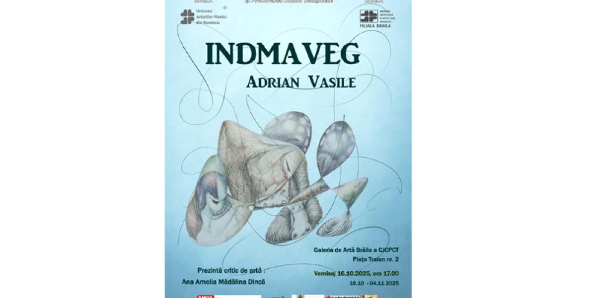 Centrul Județean pentru Conservarea și Promovarea Culturii Tradiționale Brăila, în parteneriat cu Uniunea Artiştilor Plastici din România - Filiala Brăila, îi invită pe iubitorii de artă joi, 16 octombrie 2025, începând cu ora 17.00, la vernisajul Expoziției de pictura şi grafică „INDMA VEG”, a artistului Adrian Vasile. Evenimentul va avea loc la Galeria de Artă a Centrului Județean pentru Conservarea și Promovarea Culturii Tradiționale Brăila, din Piața Traian nr. 2. Expoziția va fi deschisă publicului până la data de 4 noiembrie 2025.