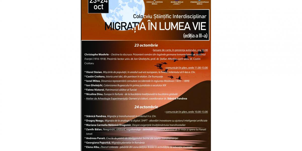 Muzeul Brăilei „Carol I” organizează, în zilele de 23 și 24 octombrie, la sediul din Piața Traian, nr. 3, Sala „Regele Ferdinand I și Regina Maria”, cea de a III-a ediție a Colocviului Științific Interdisciplinar „Migrația în lumea vie”.