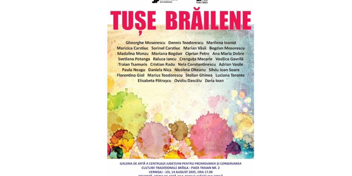 Consiliul Judeţean Brăila, Centrul Judeţean pentru Conservarea şi Promovarea Culturii Tradiţionale, Primăria Municipiului Brăila și Uniunea Artiștilor Plastici din România (UAPR) - Filiala Brăila organizează joi, 14 august, ora 17:00, la Galeria de Artă din Piața Traian nr. 2, vernisajul Expoziției „Tuşe brăilene”.