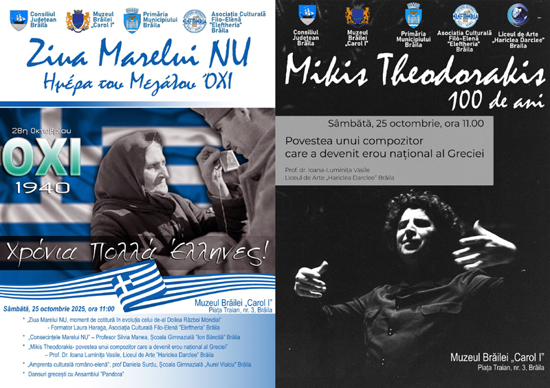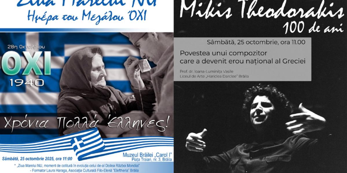 Muzeul Brăilei „Carol I” și Asociația Culturală Filo-Elenă „Eleftheria”, din Brăila, îi invită pe brăileni sâmbătă, 25 octombrie, de la ora 11:00, la sediul central al Muzeului Brăilei, din Piața Traian nr. 3, pentru a lua parte la un dublu eveniment: marcarea a 85 de ani de la intrarea Greciei în cel de-Al Doilea Război Mondial, în data de 28 octombrie 1940 - cunoscută în istorie ca „Ziua Marelui NU” sau „Ziua Demnității Naționale” - și aniversarea a 100 de ani de la nașterea marelui compozitor grec Mikis Theodorakis.