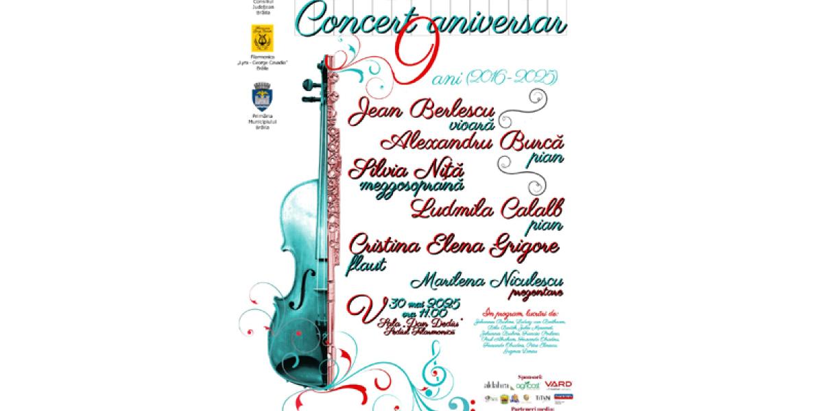 Filarmonica „Lyra - George Cavadia” Brăila sărbătorește 9 ani de muzică și emoție printr-un concert aniversar ce va avea loc vineri, 30 mai, de la ora 11:00, în Sala „Dan Dediu” (sediul Filarmonicii). Va fi un eveniment de excepție la care își vor da concursul artiști de renume: violonistul Jean Berlescu, pianistul Alexandru Burcă, mezzosoprana Silvia Niță, pianista Ludmila Calalb și flautista Cristina Elena Grigore.
