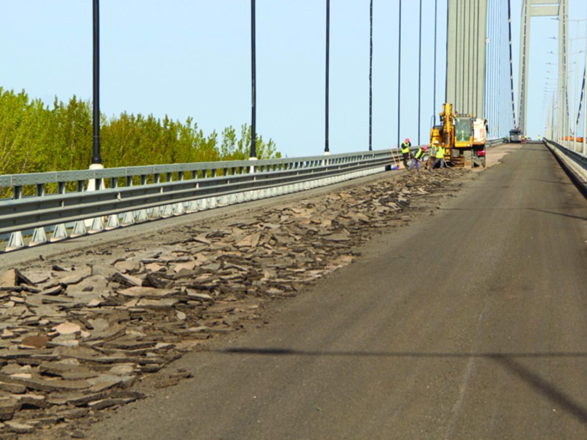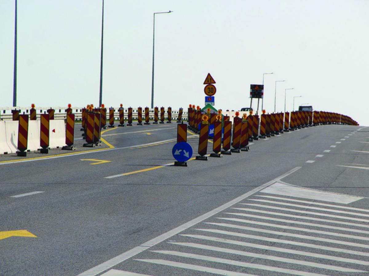 • operațiunea de decopertare a căii 1 de circulație se face doar parțial mecanic, folosindu-se și muncă manuală pentru a se proteja folia de legătură dintre tablier și mixtura asfaltică • asta după ce, astă-toamnă, la reasfaltarea căii 2 de rulare, pe sensul Tulcea - Brăila, s-a lucrat fără menajamente și a fost degradată acea folie, iar înlocuirea ei a costat foarte mult, conform unor surse bine informate • decopertarea manuală mărește durata operațiunii de reasfaltare a căii 1 Brăila - Tulcea, acesta fiind motivul pentru care circulația pe pod va fi reluată în condiții normale abia în prima decadă a lunii iunie • după cum se știe este nevoie de reasfaltarea completă a podului deoarece mixtura folosită în primă fază a cedat foarte repede, fiind nevoie constantă de reparații și reasfaltări • practic, este a cincea oară când se toarnă un nou covor asfaltic, iar de data aceasta se pare că s-a găsit formula câștigătoare • va fi folosită o mixtură bituminoasă nouă, testată într-un laborator din Italia, de la care se speră că va avea o rezistență mult mai mare
