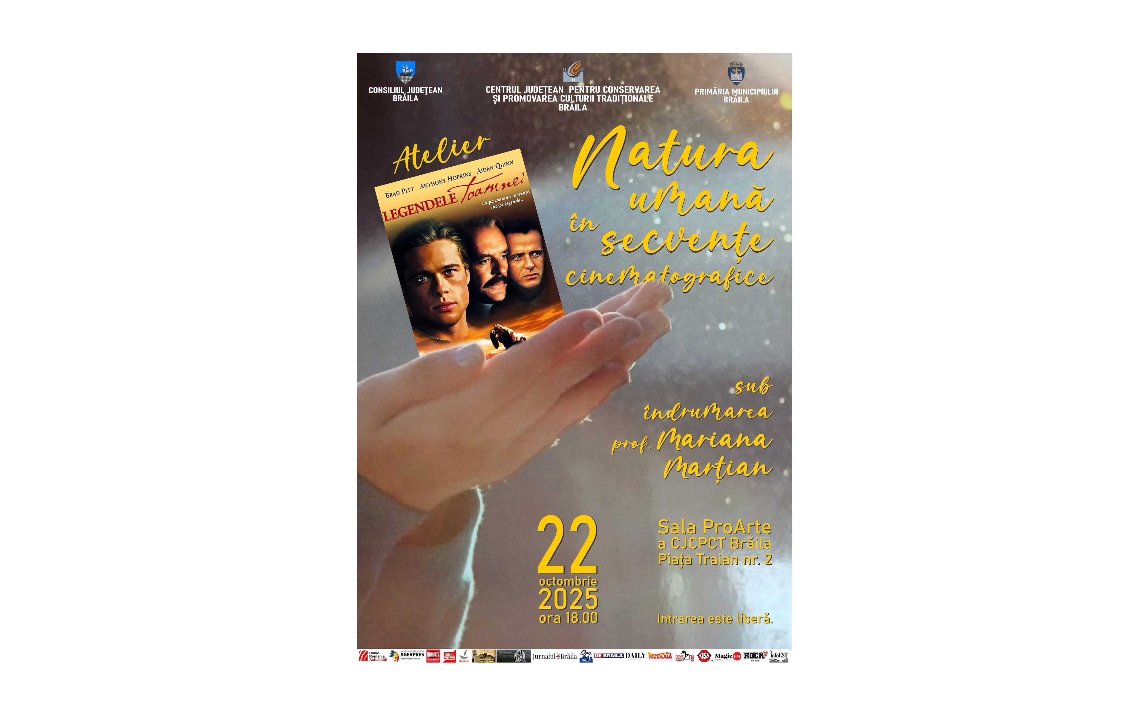 Consiliul Județean Brăila şi Centrul Județean pentru Conservarea și Promovarea Culturii Tradiționale (Centrul de Creație), cu sprijinul Primăriei Municipiului Brăila, îi invită pe brăileni miercuri, 22 octombrie, ora 18:00, la atelierul cultural bilunar intitulat „Natura umană în secvențe cinematografice”, care se derulează sub îndrumarea doamnei profesoare Mariana Marțian.