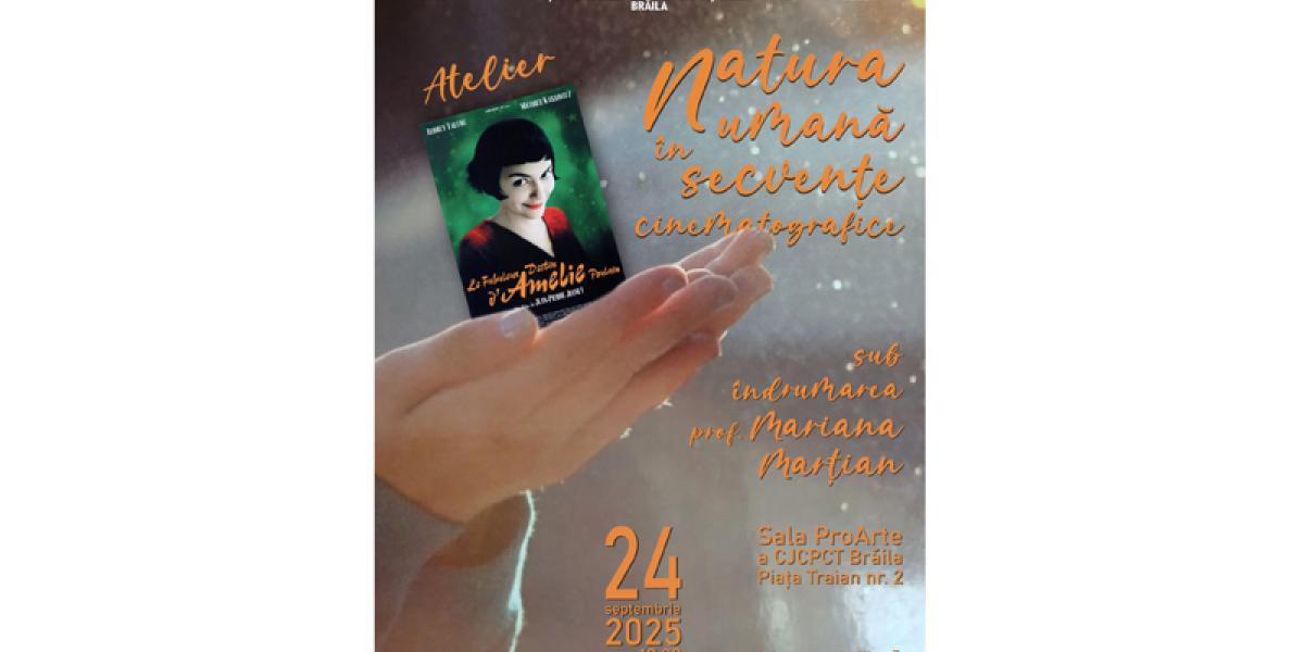 Consiliul Județean Brăila prin Centrul Județean pentru Conservarea și Promovarea Culturii Tradiționale (Centrul de Creație) și Primăria Municipiului Brăila inaugurează miercuri, 24 septembrie, începând cu ora 18:00, un nou atelier cultural intitulat „Natura umană în secvențe cinematografice”, sub îndrumarea doamnei profesoare Mariana Marțian.