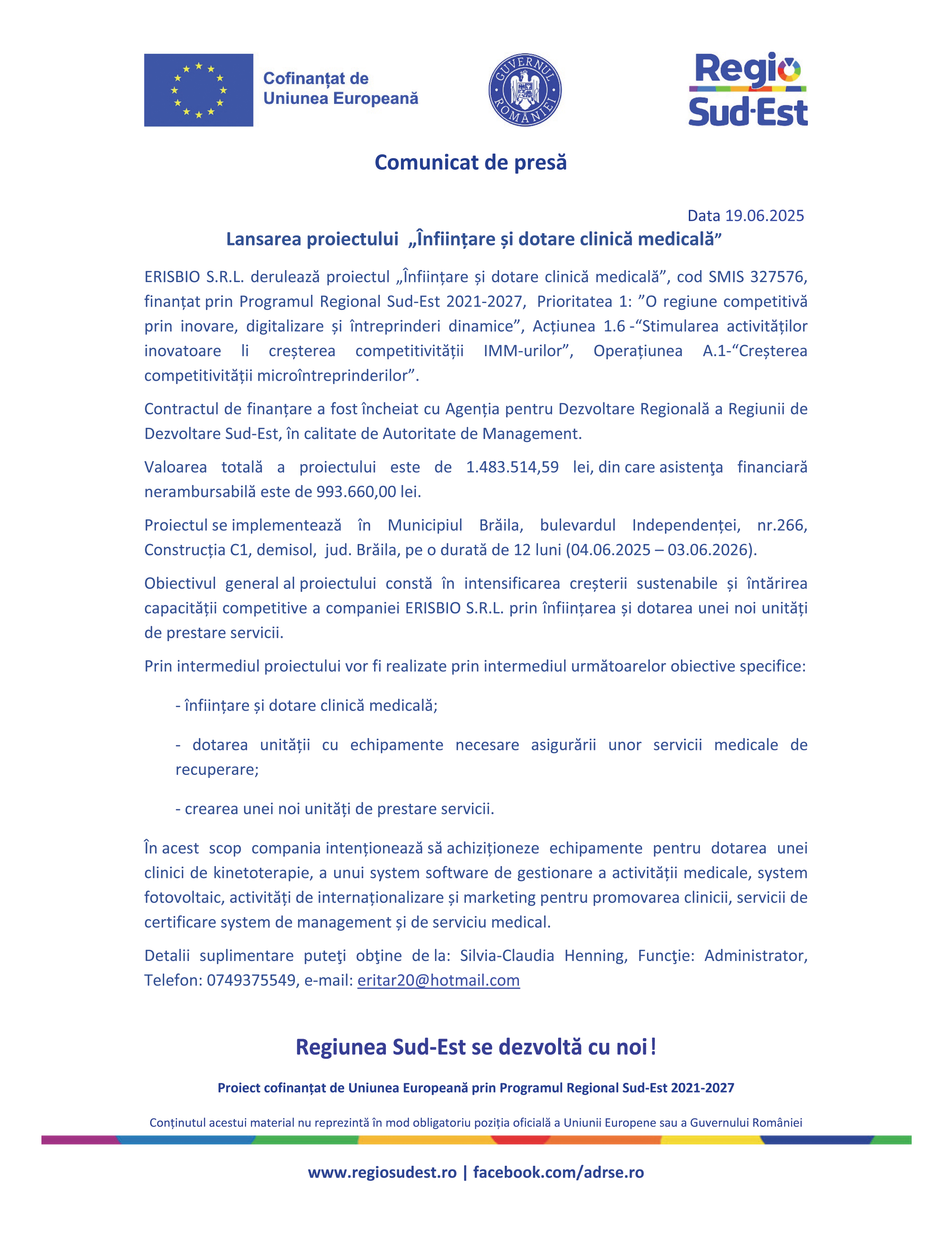 Comunicat de presă Lansarea proiectului „Înființare și dotare clinică medicală”