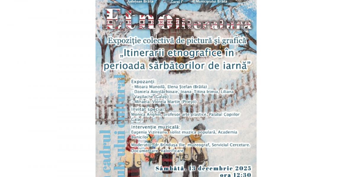 Muzeul Brăilei „Carol I” - Casa Colecțiilor Etnografice invită publicul brăilean în ziua de sâmbătă, 13 decembrie 2025, începând cu ora 12:30, la Casa Alexiu - monument istoric din Strada Polonă nr. 14, la vernisajul Expoziției colective de pictură și grafică „Itinerarii etnografice în perioada sărbătorilor de iarnă”.