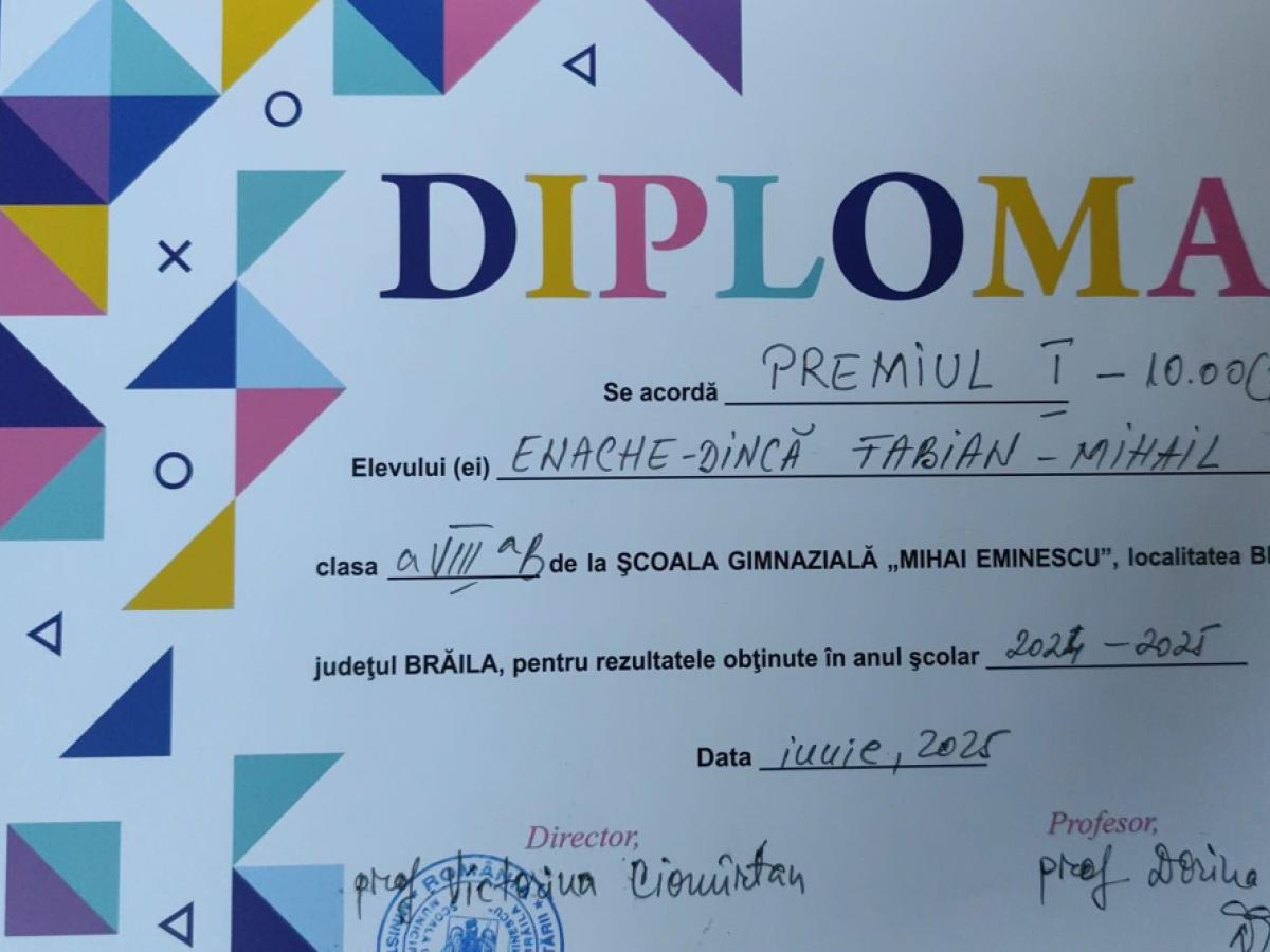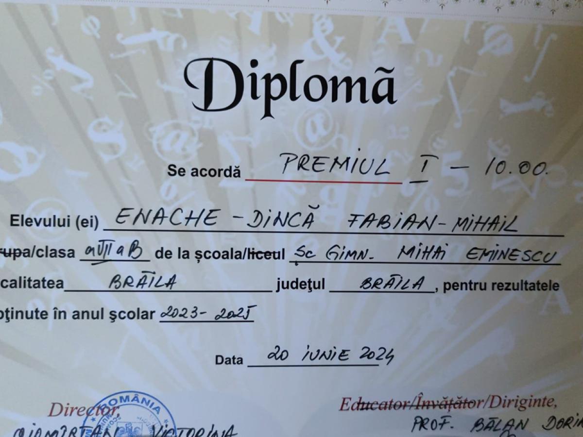 • de când a început școala, a învățat constant, a visat cu ochii deschiși și a muncit pentru visul său, iar astăzi, Mihail Fabian Dincă Enache, absolvent al Școlii Gimnaziale „Mihai Eminescu”, este singurul elev din județul Brăila care a obținut media 10 la Evaluarea Națională • cu nota maximă la ambele probe, Limba română și Matematică, Fabian confirmă o traiectorie școlară impecabilă, cu 10 pe linie din clasa pregătitoare până în clasa a VIII-a