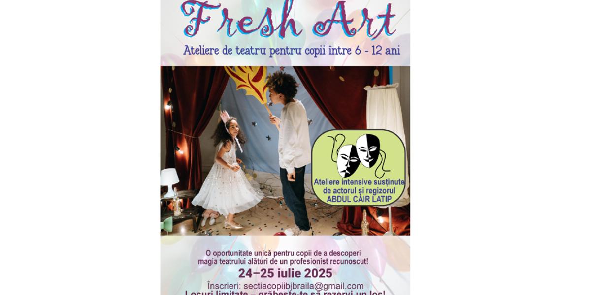 În perioada 24 - 25 iulie 2025, la Biblioteca Judeteana „Panait Istrati” Brăila - Secția de Împrumut pentru copii.Ludotecă, vor avea loc Atelierele FRESH ART de teatru pentru copii, cu Abdul Cair Latip, actor și regizor.