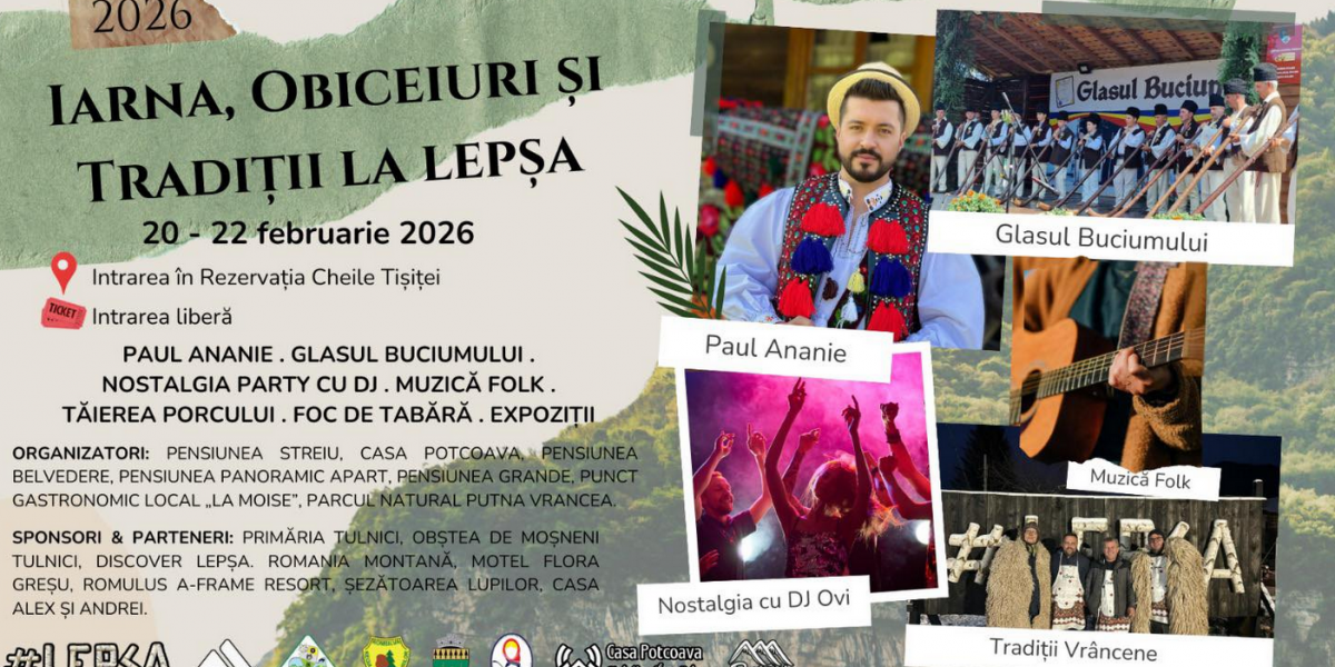 În perioada 20 – 22 februarie va avea loc la Lepșa, în județul Vrancea, cea de-a II-a ediție a evenimentului Iarna – Tradiții și obiceiuri. Ediția din acest an are loc la intrarea în Rezervația Naturală Cheile Tișiței și se anunță mai atractivă decât cea de anul trecut, promit organizatorii. Iată programul:
