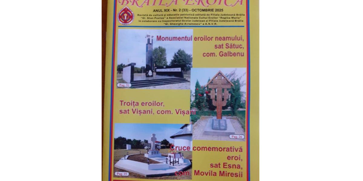 Semnalăm, cu deosebit interes, apariția numărului 33 al revistei „Brăila Eroică”, „revistă de cultură și educație patriotică” editată de Filiala Județeană Brăila „Gl. Stan Poetaș” a Asociației Naționale Cultul Eroilor „Regina Maria”, în colaborare cu Inspectoratul Școlar Județean Brăila și Filiala Județeană Brăila „Gl. Gheorghe Avramescu” a ANVR. Publicația poate fi răsfoită la Cercul Militar Brăila, de pe Calea Călărașilor. Spicuim din cuprins: