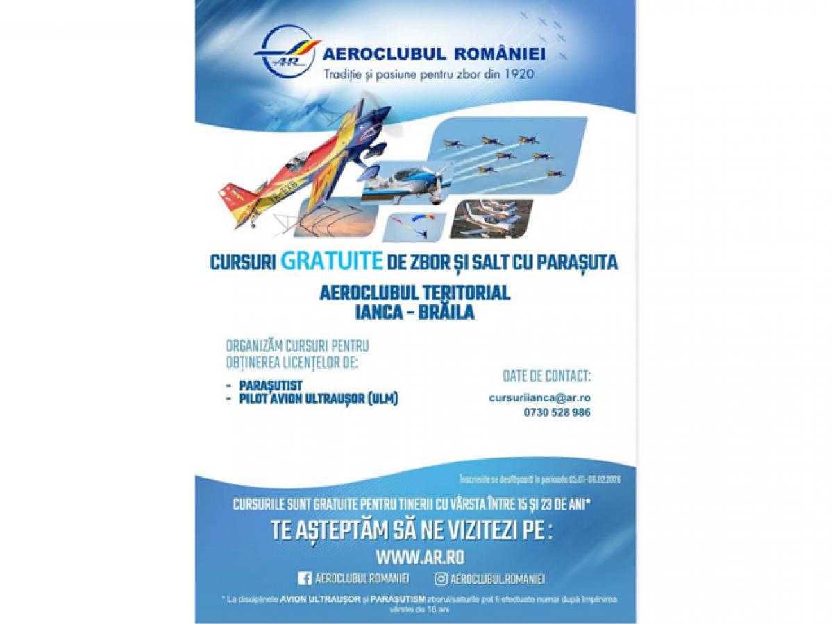Aeroclubul Teritorial Ianca face în această perioadă înscrieri pentru cursuri gratuite de zbor cu avion ultraușor, balon cu aer cald și salt cu parașuta. Pentru cursurile gratuite pot aplica tineri cu vârste între 15 ani (împliniți) și 23 de ani (neîmpliniți). Înscrierile au început pe 5 ianuarie și se vor desfășura până pe 6 februarie, iar festivitatea de deschidere a cursurilor va avea loc sâmbătă, 7 februarie. Pentru modulul teoretic, care se va desfășura până în luna aprilie, nu există o limită de înscrieri, vor fi acceptați toți tinerii interesați. La finalul acestui modul, însă, se va susține un examen, iar pentru cursurile gratuite se va face o departajare în funcție de notele obținute. Astfel, notele cele mai bune, în ordine descrescătoare, vor completa numărul de locuri pentru cursurile fără bani. După cum ne-au informat reprezentanții aerodromului, încă nu a fost stabilit cu exactitate numărul de locuri pentru cursuri gratuite organizate la Ianca în acest an. Aeroclubul României va emite o decizie în acest sens până pe data de 6 februarie. Cert este că, dacă vor fi, de exemplu, 25 de locuri, primele 25 de medii se vor încadra pentru cursurile gratuite. Cei cu medii mai mici vor putea continua pregătirea, dar contracost. Tot contracost se pot înscrie și cursanți cu vârsta peste 23 de ani. Cursurile se vor desfășura sâmbăta și duminica, iar după parcurgerea tuturor etapelor teoretice și practice, cursanții care vor trece de examenele finale vor obține licență de pilot aeronave ultraușoare, respectiv licență de parașutist.