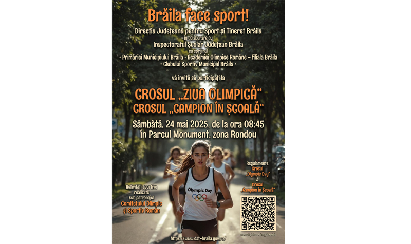 • brăilenii pot participa la crosurile “Campion în Școală” și “Ziua Olimpică” pe 24 mai 2025, începând cu ora 8:45