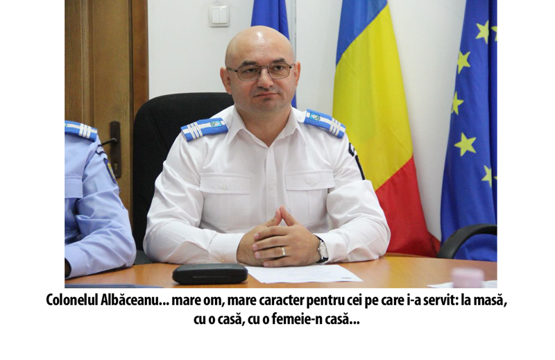Ouuuups! Nu se poate așa ceva!!! Cuuuum? Jandarmul șef, însuși colonelul Albăceanu, corectul, cinstitul, profesionistul, premiatul pe la toate galele de excelență, să fie acuzat de procurorii DNA? Să-i fie ascultate telefoanele, să-i fie monitorizate drumurile, relațiile, rudele? Să fie percheziționat și-n ”fund”? Nu putem crede așa ceva!!! Păi, să ne aducem aminte cum și de la cine au pornit acuzele împotriva actualului prefect Iulian Timofei! În baza probelor furnizate de jandarmerie, sub comanda lui, Timofei a fost făcut cu ou și cu oțet, i s-au făcut plângeri penale, a fost urmărit de cel mai tare jurnalist dintre milițieni... Să nu uităm articolele lui El Comandante zis și Chivu, să nu uităm cum marele liberal Popa Alexandru îi cerea demisia lui Timofei chiar cu o zi înainte de alegerile prezidențiale... Și-n loc de Timofei coruptul, aflăm de Albăceanu coruptul?! Domnu' Popa, cui îi mai cereți demisia, că zice presa centrală că lui Albăceanu i se promisese gradul de general și postul de șef la Poliția de Frontieră la nivel național!!! Ptiu, drace! Și taman acum i s-a înfundat, după ce, zic procurorii, s-a îndulcit la afaceri cu fast-fooduri, imobiliare și plasare de muncitori din străinătate. Adică a venit Albăceanu din Brăila să facă afaceri grele în București! Să se bage el ca musca-n laptele mafiei imobiliare și-a traficului de muncitori nepalezi! Adevărul e că demult n-am mai avut așa un șef al unei instituții de forță din Brăila băgat în atâtea kkturi murdare... cam de când era Chivu Cătălin șef la IPJ Brăila. Dar noooooo, nu putem crede așa ceva! Sigur e o făcătură politică! Sigur binomul Coldea – Kovesi e de vină! Sau PSD-ul? Nu-i așa domnu' Popa, că PSD-ul e vinovat? Sau, în realitate, colonelul Albăceanu o fi fost și el doar un biet interpus! Acu' e acu'! (Louis de Funes)