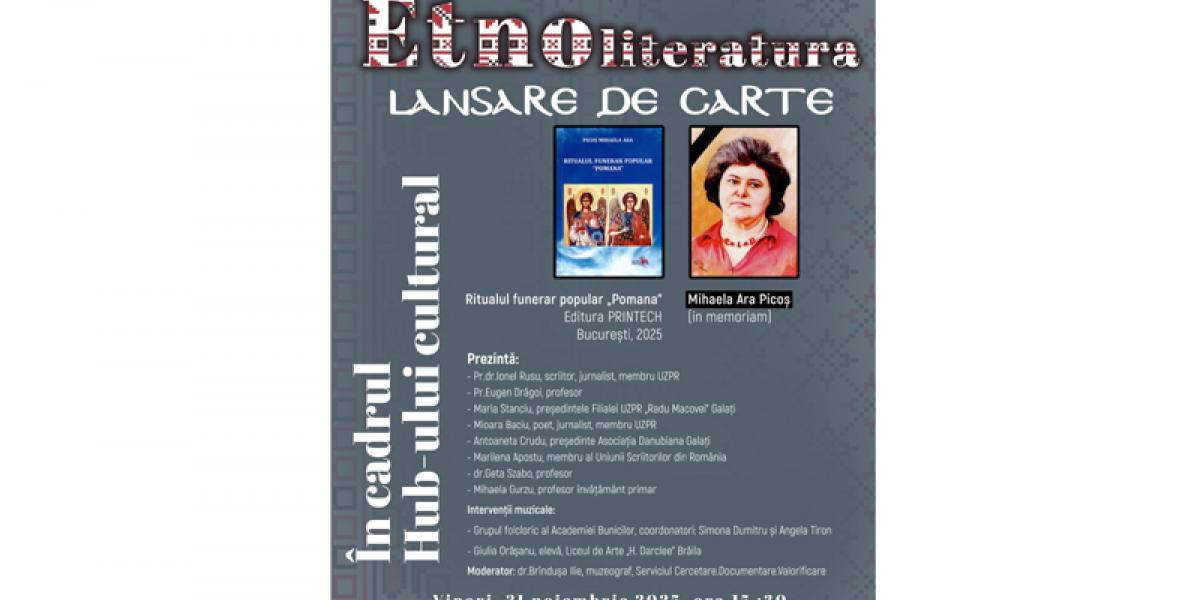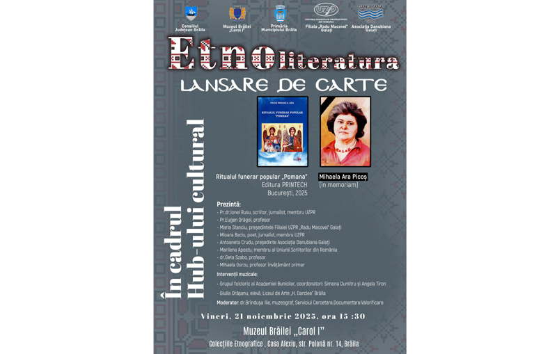 Muzeul Brăilei „Carol I” - Casa Colecțiilor Etnografice, alături de Filiala Uniunii Ziariștilor Profesioniști din România (UZPR) „Radu Macovei” Galați și Asociația Danubiana Galați invită publicul brăilean în ziua de vineri, 21 noiembrie, începând cu ora 15.30, la lansarea cărții Ritualul funerar popular „Pomana”, apărută la Editura PRINTECH, București, 2025, autor Mihaela Ara Picoș (in memoriam), în cadrul Hub-ului cultural „Etnoliteratura”.