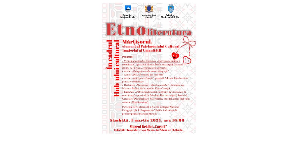 Muzeul Brăilei „Carol I” - Colecțiile Etnografice organizează sâmbătă, 1 martie, de la ora 10:00, o nouă întâlnire în cadrul Hub-ului cultural „Etnoliteratura”. Evenimentul va fi organizat la Casa Alexiu - monument istoric de arhitectură din Strada Polonă nr. 14 - și va avea ca temă „Mărțișorul, element al Patrimoniului Cultural Imaterial al Umanității”.