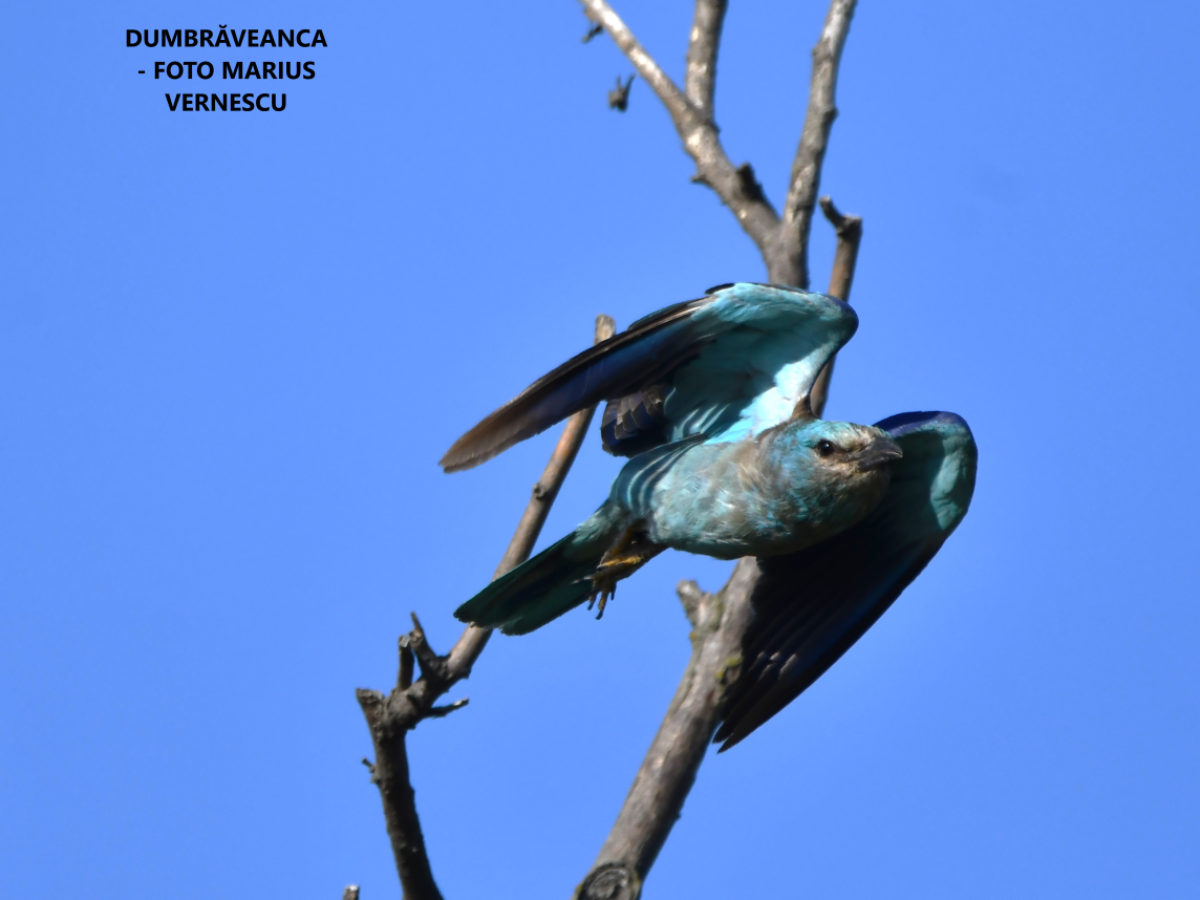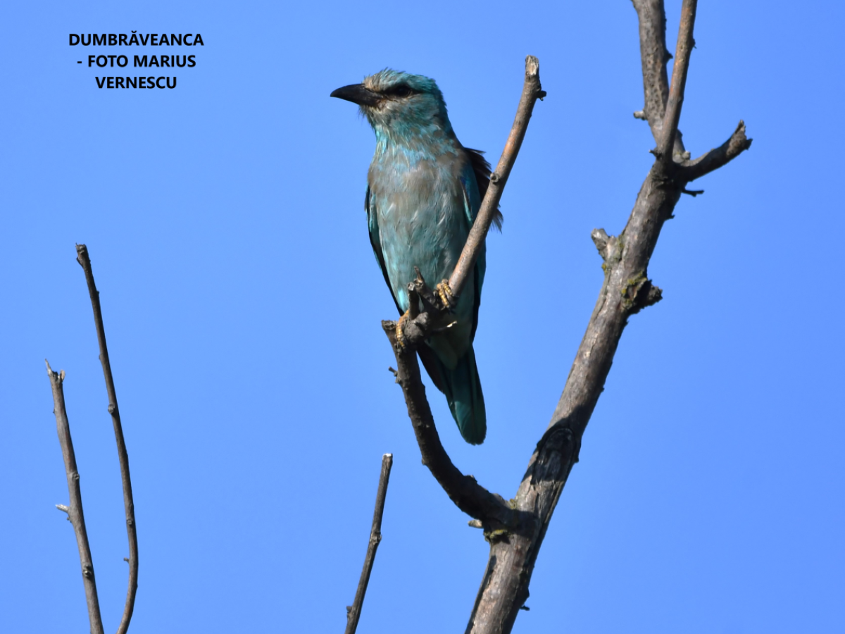 Dumbrăveanca (Coracias garrulus) - Specie de pasăre de talie medie, cu un colorit spectaculos, inconfundabil. Sexele sunt asemănătoare. Capul, aripile și abdomenul sunt albastru deschis, cu tentă verzuie. Spatele este maroniu-roșiatic. Lungimea corpului este de 29-32 de cm, anvergura aripilor este de 52-57 de cm, iar greutatea de 127-170 de grame.