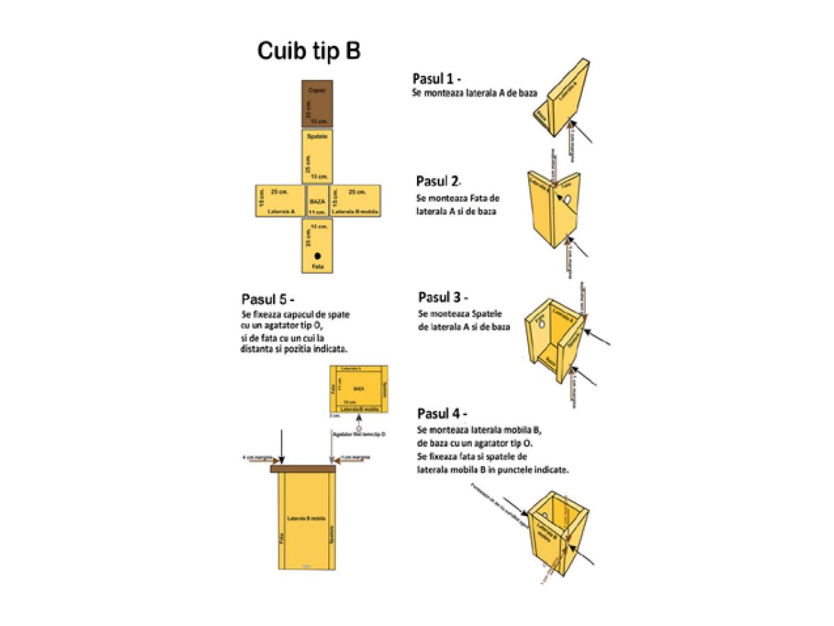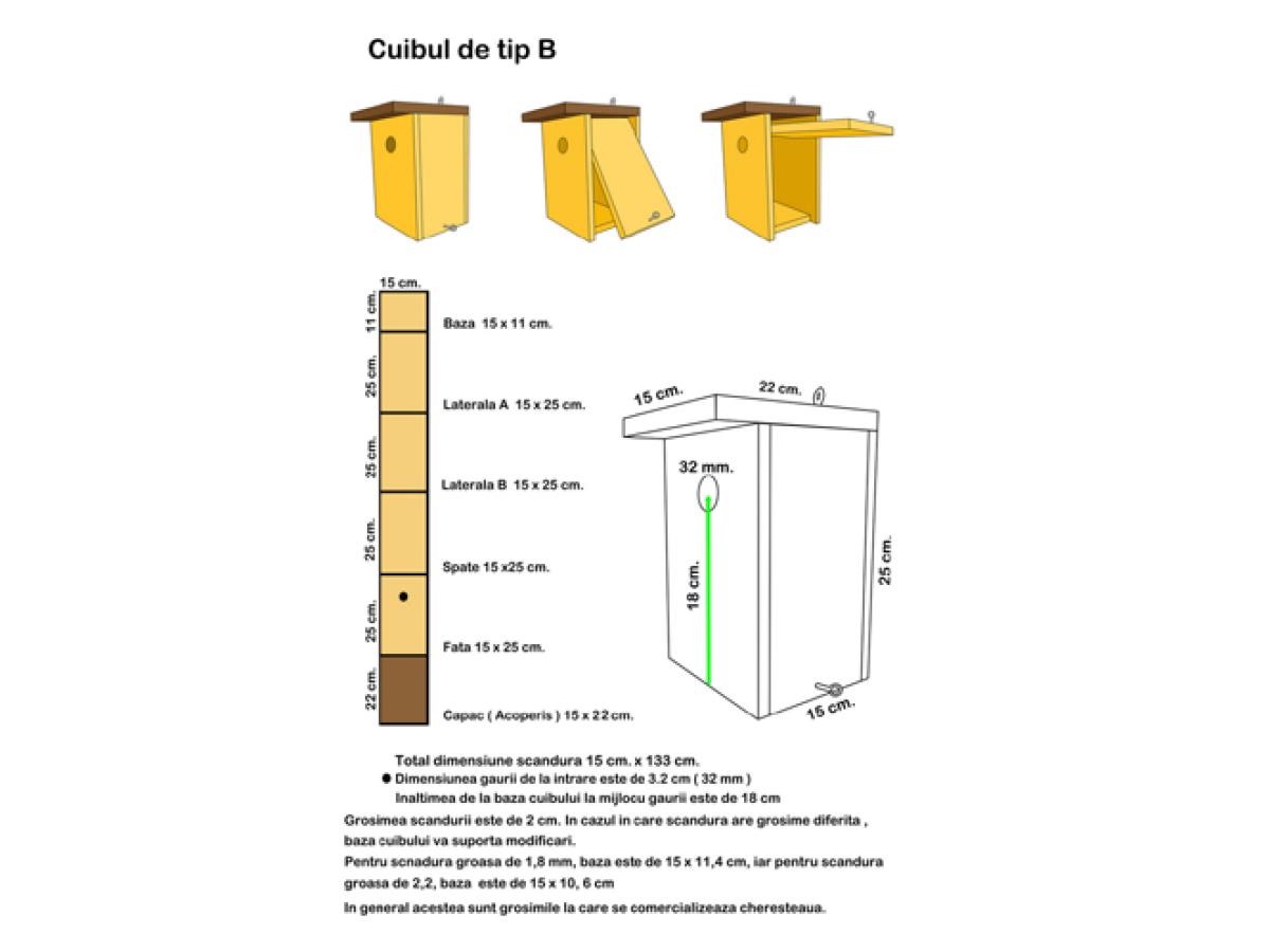 - Este foarte important să menținem materialul și dimensiunile potrivite pentru speciile vizate. Aceste informații (materialul și dimensiunea) se bazează pe mai mulți ani de cercetări și observații din partea ornitologilor, pentru a găsi varianta cea mai potrivită și eficientă, de a înlocui fisuri, scorburi sau mici orificii naturale care sunt folosite de către speciile de păsări sălbatice.