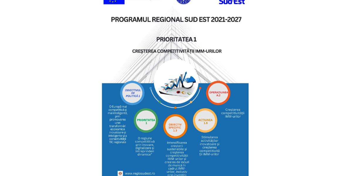 Agenția pentru Dezvoltare Regională Sud-Est, în calitate de Autoritate de Management pentru Programul Regional Sud-Est 2021-2027, anunță lansarea apelului de proiecte dedicat IMM-urilor în cadrul Priorității 1 “O regiune competititivă prin inovare, digitalizare și întreprinderi dinamice”, Acțiunea 1.6 ”Stimularea activităților inovatoare și creșterea competitivității IMM-urilor”. Această acțiune vizează creșterea competitivității IMM-urilor și crearea de locuri de muncă în cadrul acestora prin inovare, digitalizare și dezvoltarea de întreprinderi dinamice, în vederea unei îmbunătățiri semnificative a capacității tehnologice, industriale și organizaționale de a gestiona dezvoltarea de produse și servicii.