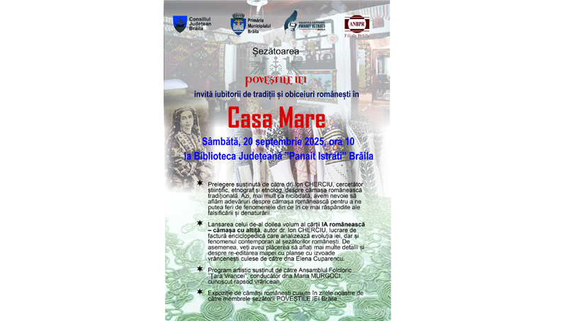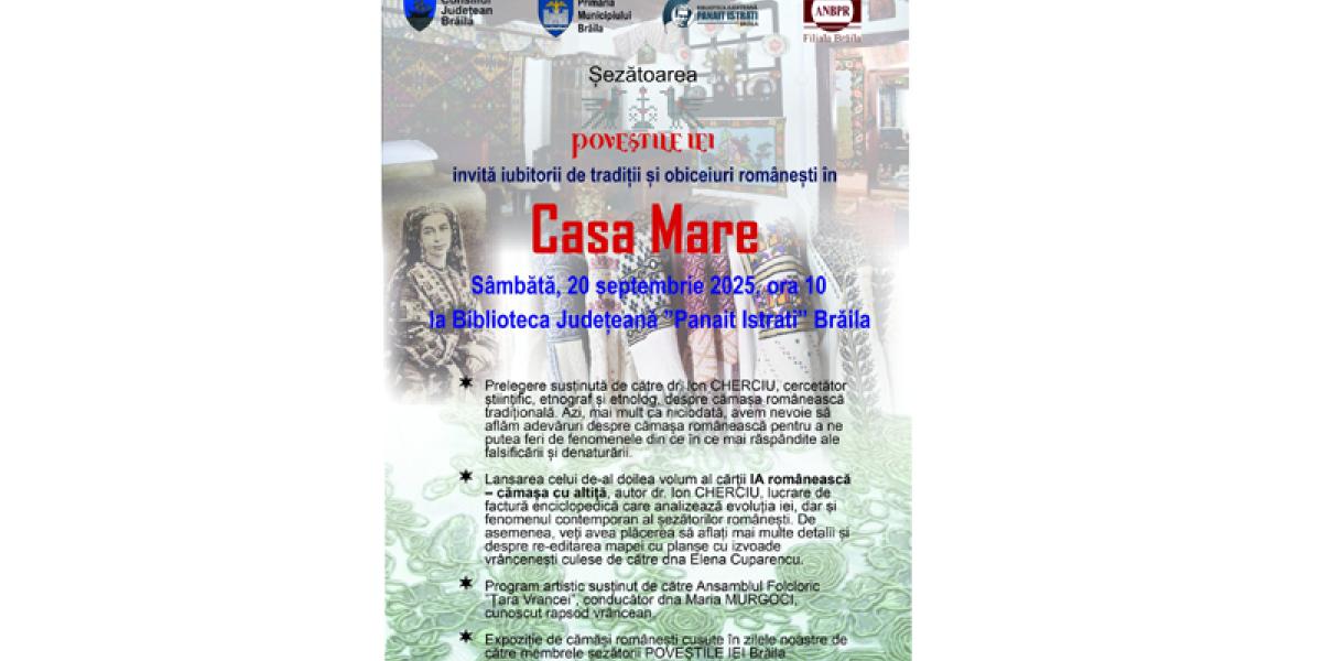Șezătoarea „Poveștile IEI” îi invită pe brăileni la o nouă ediție a evenimentului Casa Mare, care va avea loc sâmbătă, 20 septembrie, de la ora 10.00, la sediul Bibliotecii Județene „Panait Istrati” Brăila, eveniment care-și propune să-i aducă împreună pe toți iubitorii tradițiilor românești.