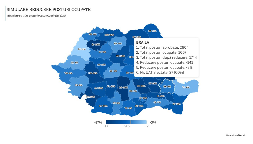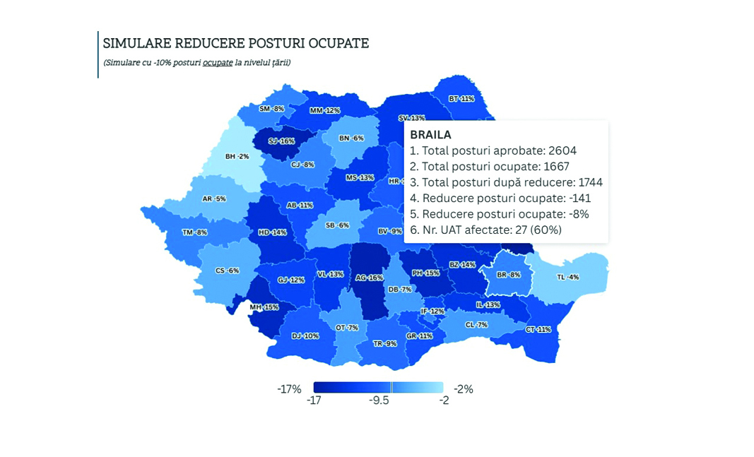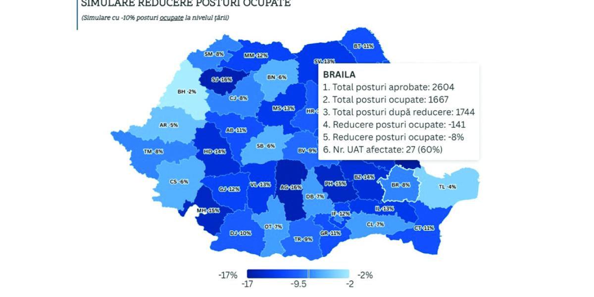 • Guvernul Ilie Bolojan a publicat, marți, harta privind reducerea posturilor ocupate la nivelul primăriilor și consiliilor județene din România • dacă unele județe au fost lovite destul de dur, Județul Brăila stă destul de bine • potrivit simulării Executivului, ar trebui concediați 141 de funcționari, deci 8% • în Galați, prin comparație, discutăm despre concedierea a 17% din angajați, adică peste 500 de angajați • Brăila, în schimb, pe municipiu, ar putea face angajări, atât de bine stă • primarul Dragomir nu dă pe nimeni afară, dar nici nu face angajări, ci investește în proiecte banii economisiți • președintele CJ Brăila, Francisk Iulian Chiriac (liderul PSD Brăila), avertizează că situația este mai complicată decât pare și că mulți dintre funcționarii ce vor fi disponibilizați ar putea acționa autoritățile în instanță, iar dacă vor avea câștig de cauză, cheltuielile ar putea fi mult mai mari decât cele cu salariile în prezent