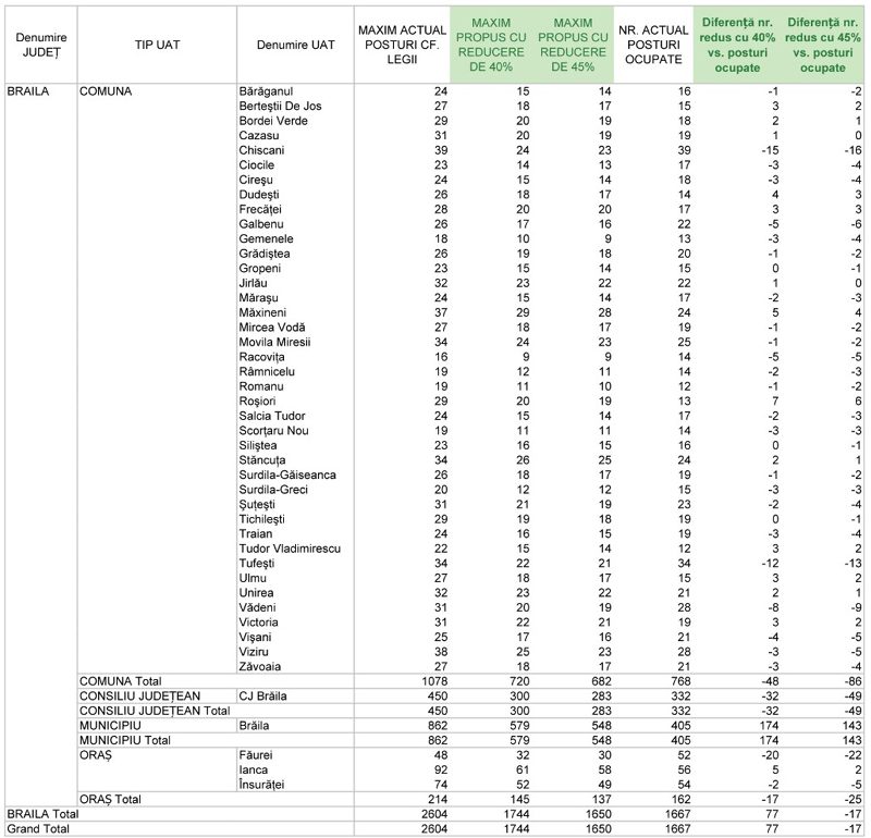 Revenind la Județul Brăila, potrivit datelor publicate de Executiv, s-au făcut două simulări: o reducere cu 10% a posturilor ocupate (40% a numărului maxim aprobat de posturi) și o reducere cu 15% a posturilor ocupate (45% a numărului maxim aprobat de posturi). Guvernul a atașat un fișier Excel, unde pot fi văzute datele rezultate în baza acestei simulări pentru fiecare județ în parte, totul defalcat pe UAT-uri.