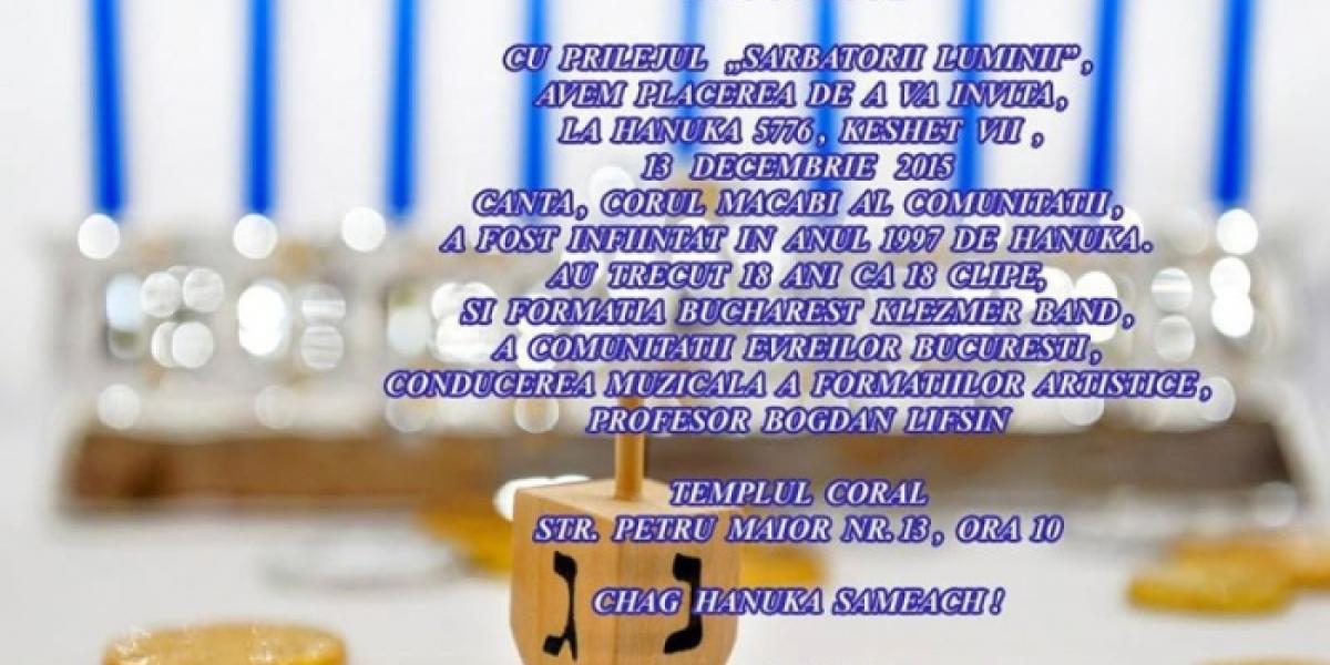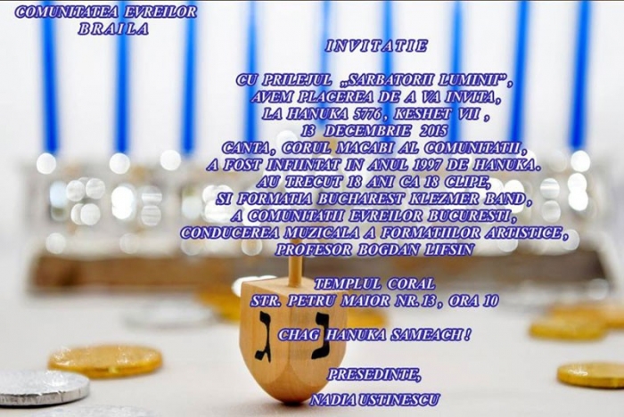 Comunitatea Evreilor din Brăila sărbătoreşte duminică, 13 decembrie, "Hanuka. Sărbătoarea Luminii". Evenimentul va avea loc de la ora 10.00, la Templul Coral din strada Petru Maior, nr. 13, unde va cânta Corul Macabi al comunităţii, înfiinţat în urmă cu 18 ani, de Hanuka, şi Formaţia Bucharest Klezmer Band, a comunităţii evreilor Bucureşti. Conducerea muzicală a formaţiilor artistice este asigurată de prof. Bogdan Lifsin.