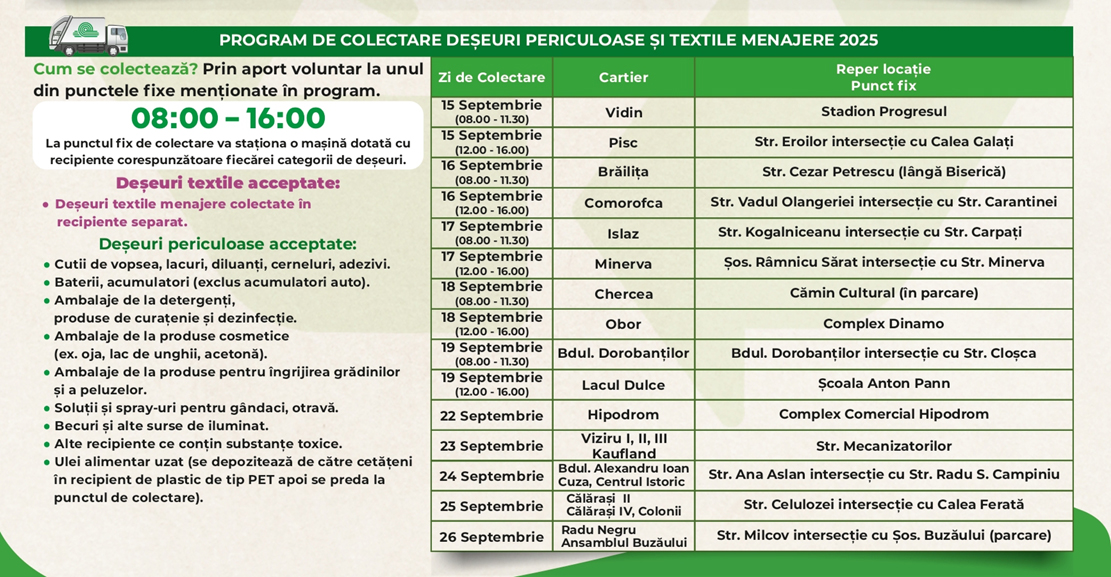 • este vorba despre deșeuri voluminoase, textile și periculoase • pe raza municipiului Brăila, campania se va derula în perioada 15 - 27 septembrie, conform graficelor atașate