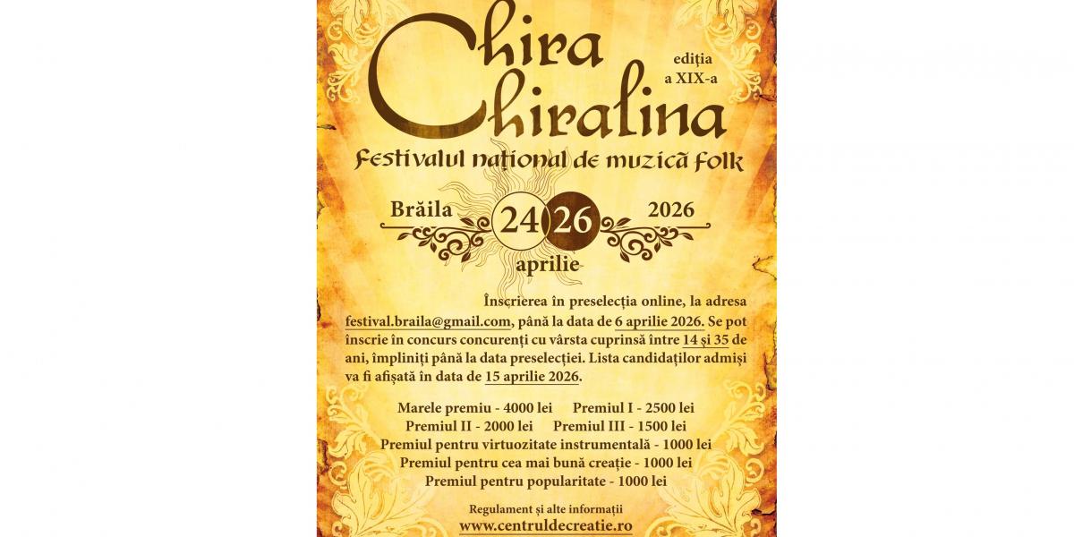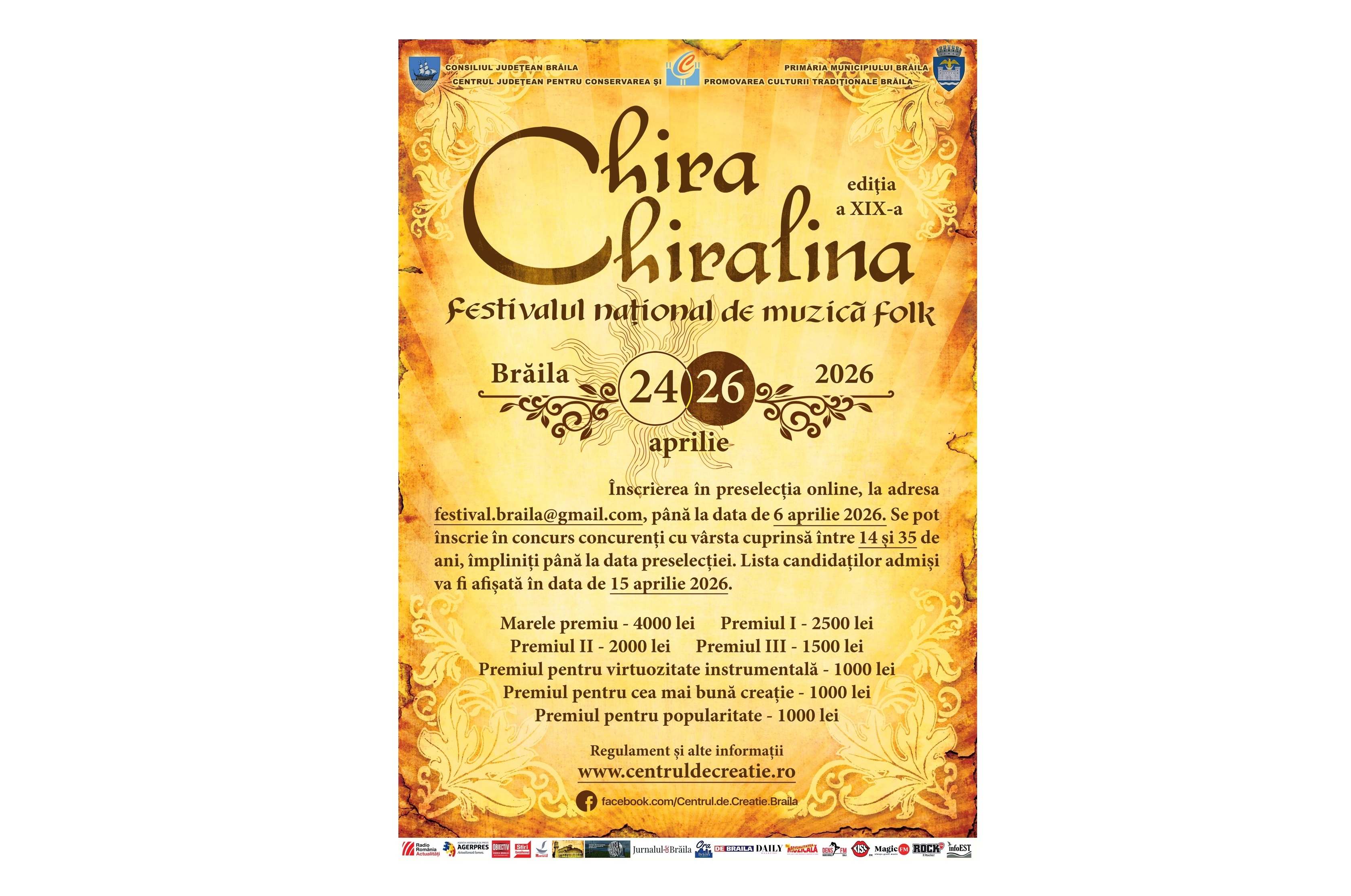 Consiliul Județean Brăila, Centrul Județean pentru Conservarea și Promovarea Culturii Tradiționale (Centrul de Creație) și Primăria Municipiului Brăila organizează, în perioada 24-26 aprilie 2026, cea de-a XIX-a ediție a Festivalului Național de Folk „Chira Chiralina”. Festivalul se va desfășura după următorul program: