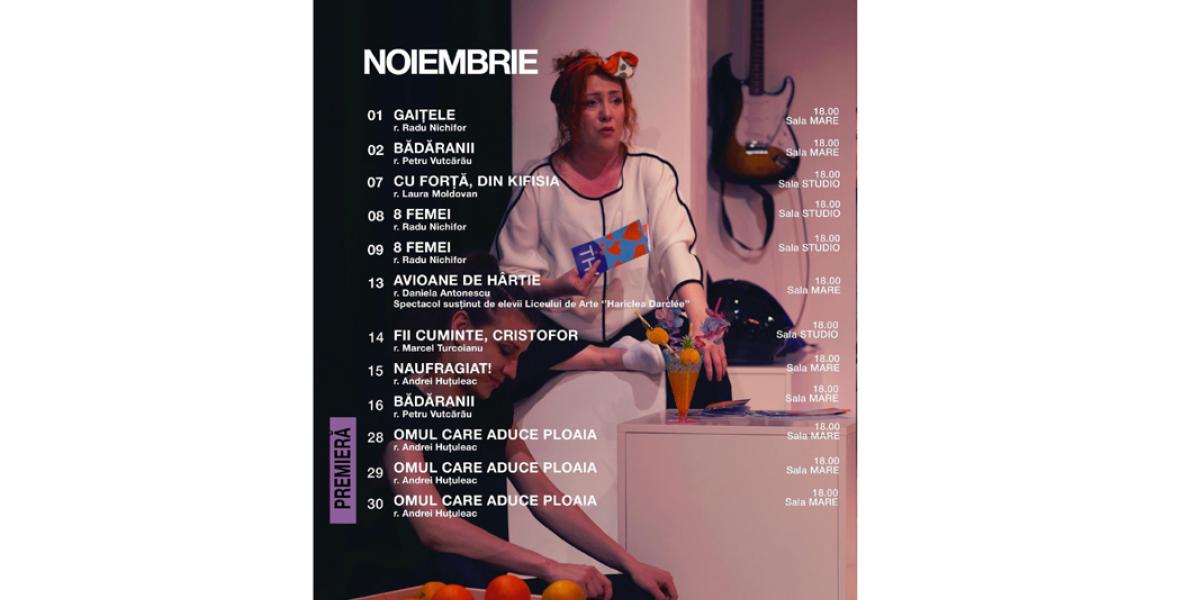 » JOI 13 noiembrie, Sala Mare, ora 18:00, “AVIOANE DE HÂRTIE“, de Elise Wilk, regia Daniela Antonescu. Spectacol susținut de elevii Liceului de Arte “Hariclea Darclée“.