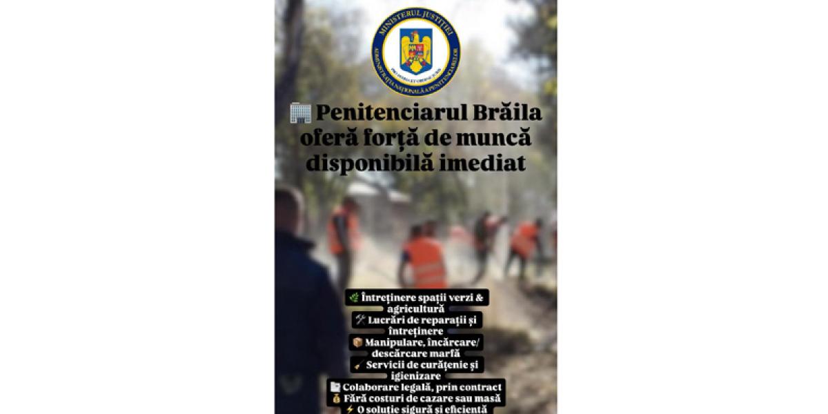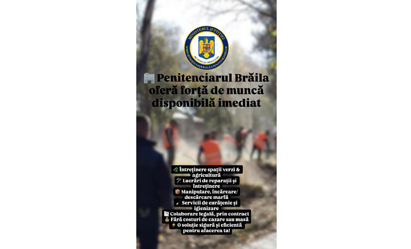 Deținuți scoși la muncă, în condiții avantajoase! Penitenciarul Brăila lansează un apel către angajatorii interesați de colaborarea în domeniul utilizării forței de muncă din rândul persoanelor private de libertate. Instituția oferă posibilitatea încadrării acestora în diverse activități economice – construcții, producție, ambalare sau servicii de curățenie – printr-un cadru legal clar și avantajos. ”Colaborarea presupune lipsa costurilor legate de cazare, masă sau contribuții sociale, acces la o forță de muncă disponibilă imediat, disciplinată și supravegheată, precum și sprijin logistic și administrativ din partea penitenciarului. Această oportunitate reprezintă atât un sprijin real pentru mediul de afaceri, cât și un pas important în procesul de reintegrare socială a persoanelor aflate în detenție”, se arată în comunicatul transmis de agent principal Cosmin Nicoară, purtător de cuvânt al Penitenciarului Brăila.