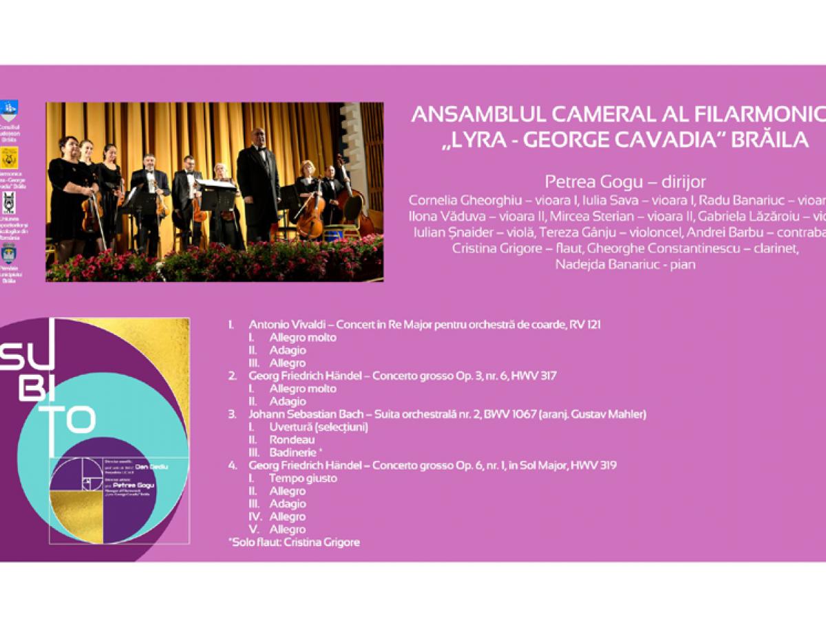 Vineri, 3 octombrie, începe Festivalul Național al Muzicii de Cameră SUBITO de la Brăila, care propune, timp de trei zile, întâlniri memorabile cu ansambluri și artiști de renume, diversitatea lor și originalitatea repertoriilor dând naștere unor adevărate „arhitecturi sonore” unde tradiția, clasicul și contemporanul se completează în mod firesc. Evenimentul este organizat de Consiliul Județean Brăila, Primăria Municipiului Brăila, Filarmonica „Lyra - George Cavadia” și Uniunea Compozitorilor și Muzicologilor din România, iar prezentarea va fi asigurată de prof. Marilena Niculescu și prof. Alexandra Gurgu. Biletele pentru Festivalul SUBITO pot fi achiziționate de la Agenția Filarmonicii „Lyra - George Cavadia”, din Strada Ana Aslan nr. 29, sau online, de pe platforma BLT.ro.
