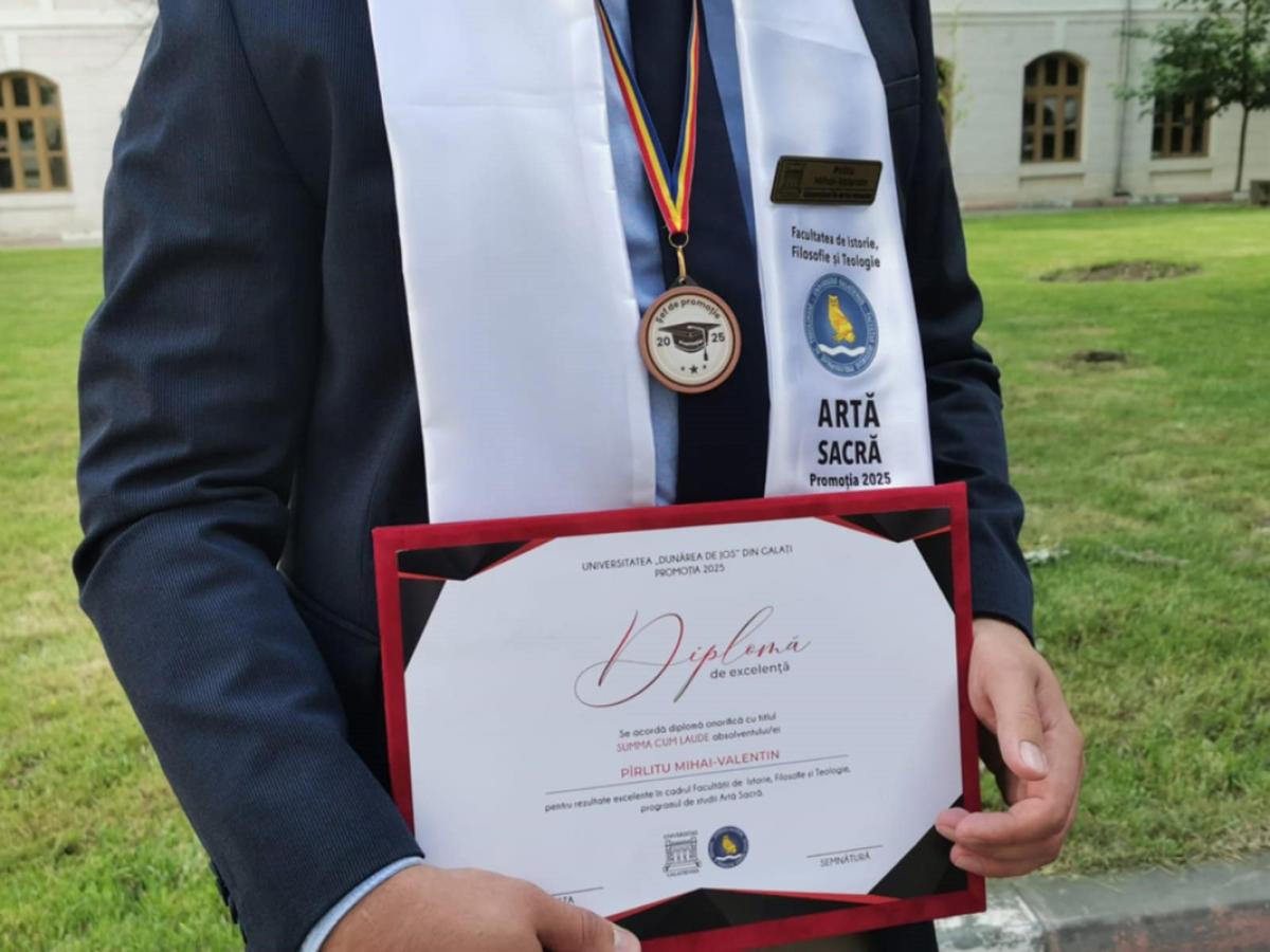 Fiu al satului Valea Cânepii, absolvent al Liceului „Hariclea Darclee” și al Facultății de Arhitectură Navală Galați, Mihai-Valentin Pîrlitu a absolvit, anul acesta, cu titlul „Summa cum laude” (cea mai înaltă distincție academică conferită la absolvirea cursurilor), ca șef de promoție cu media generală 9,86, specializarea Arta Sacră (Departamentul Teologie) la Facultatea de Istorie, Filosofie și Teologie a Universității „Dunărea de Jos”. Crescut într-o familie creștină din Bărăganul Brăilei și înzestrat de Dumnezeu cu un talent nativ, care i-a uimit pe toți, Mihai-Valentin țintește și mai sus. El intenționează să urmeze un program de master în arte vizuale și să se înscrie la programul de ucenicie al Patriarhiei Române, pentru pictură bisericească.