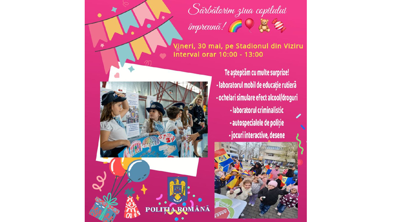 Pentru a marca Ziua Copilului, polițiștii brăileni pregătesc surprize pentru cei mici. Vineri, copiii sunt invitați la stadionul din Viziru, începând cu ora 10.00, unde polițiștii de la Rutier îi așteaptă cu lecții de educație rutieră, în cadrul unor jocuri adaptate vârstei. Elevii prezenți pot testa și ochelarii care simulează consumul de alcool sau droguri, tocmai pentru a înțelege de ce este interzis consumul acestora de către cei care se urcă la volan. Copiii vor avea parte și de alte surprize, astfel că sunt invitați cât mai mulți, alături de părinți, bunici și profesori.