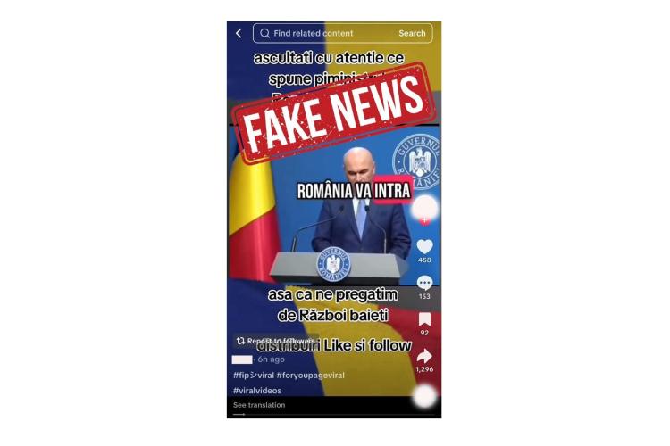 „Vă semnalăm o dezinformare distribuită recent în mediul online, referitoare la așa-zise „declarații” realizate cu ajutorul programelor de inteligență artificială din care reiese că prim-ministrul Ilie Bolojan anunță intrarea României în război, începând cu luna septembrie 2025. Clipul este fals și face parte dintr-o acțiune de manipulare intenționată a opiniei publice. Prim-ministrul României nu a susținut astfel de declarații, iar România nu intră în război”, precizează surse oficiale MApN.